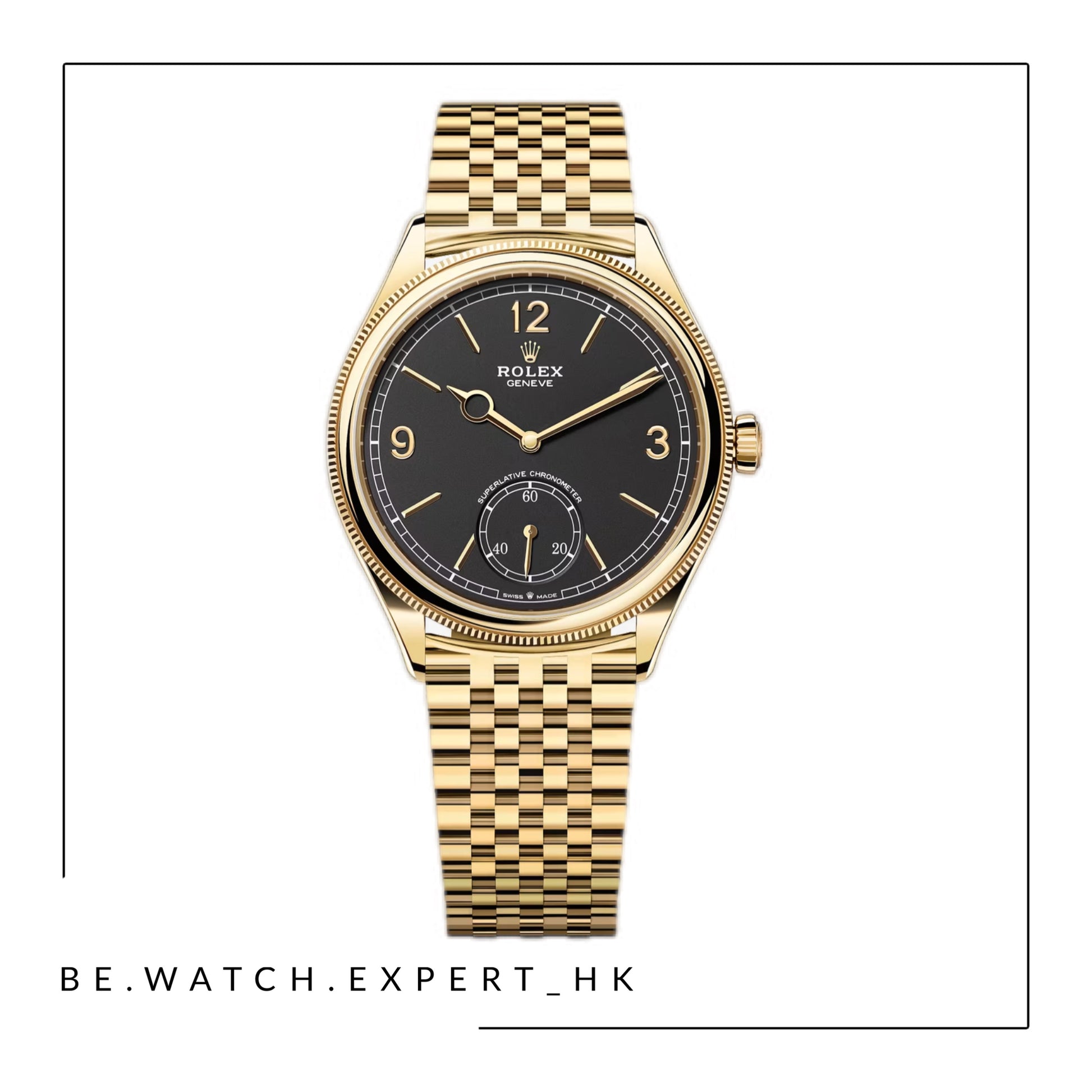 18K黃金款,搭配39毫米錶殼、醇黑色錶面及七臻型(Settimo)錶帶