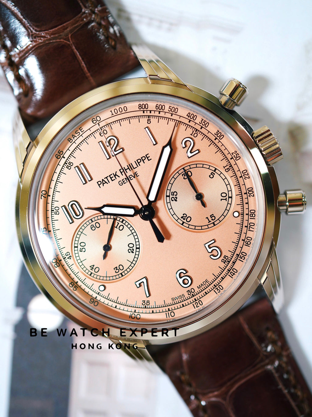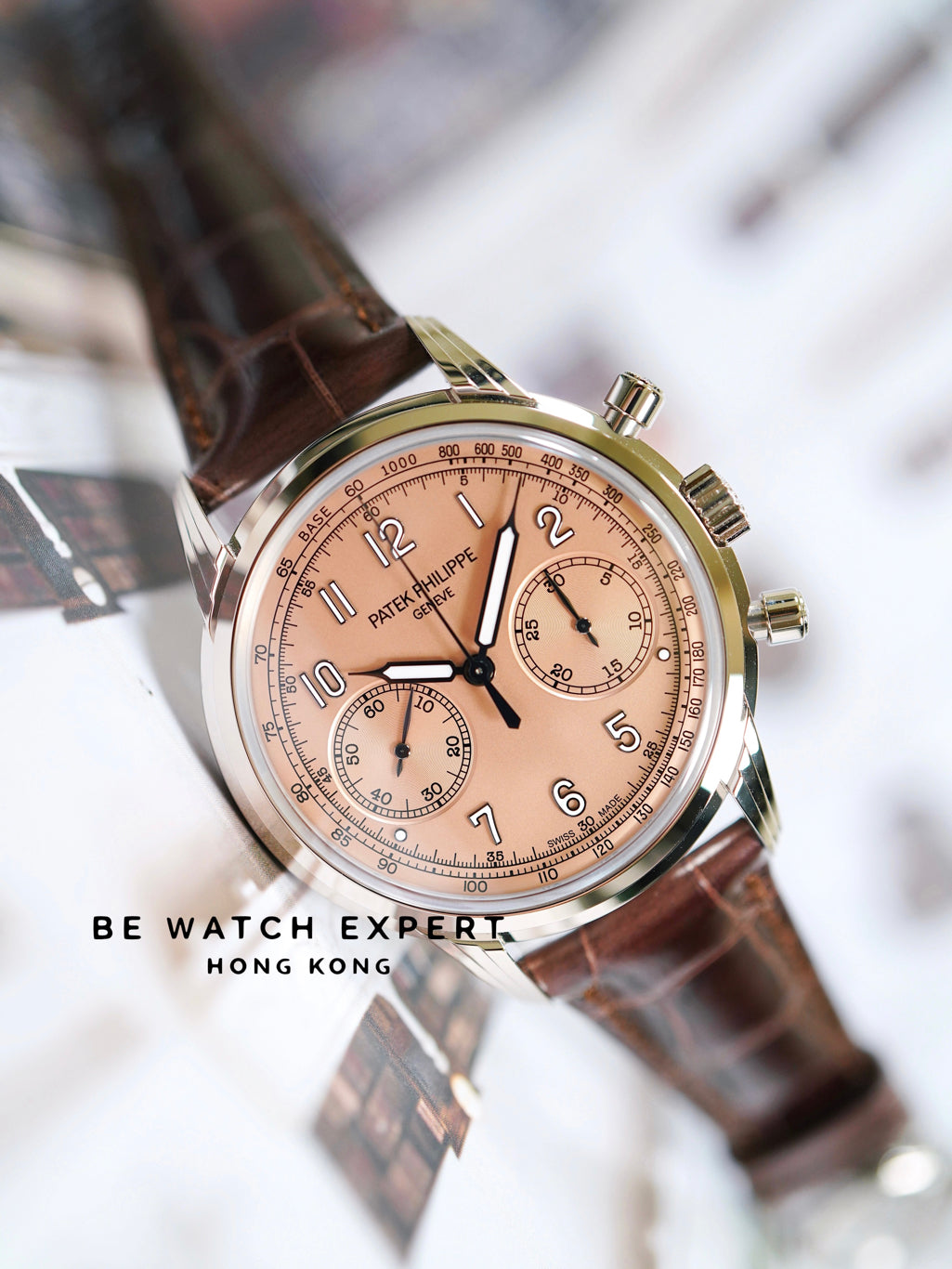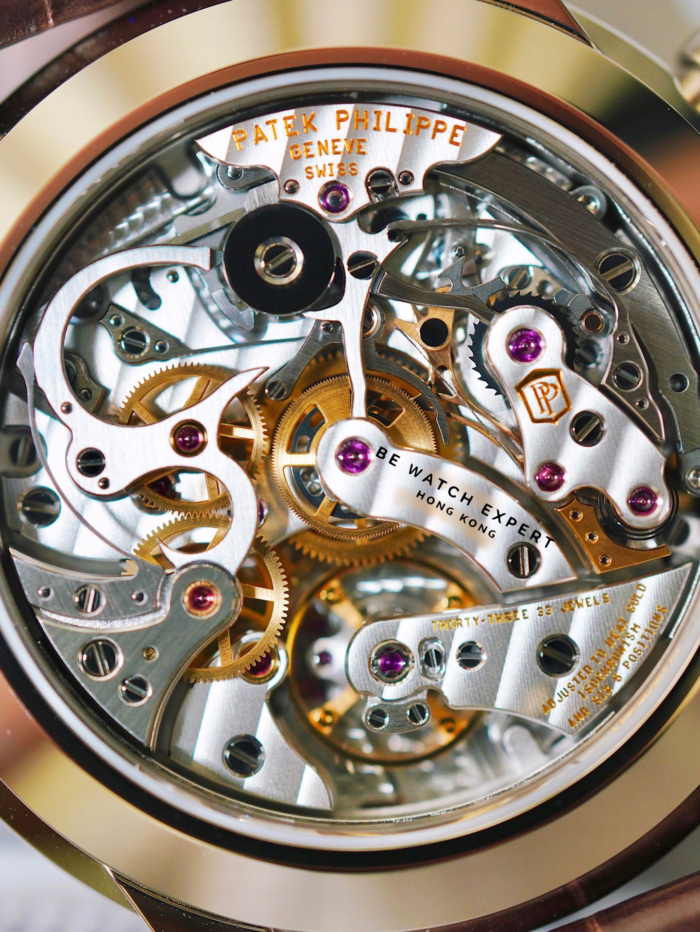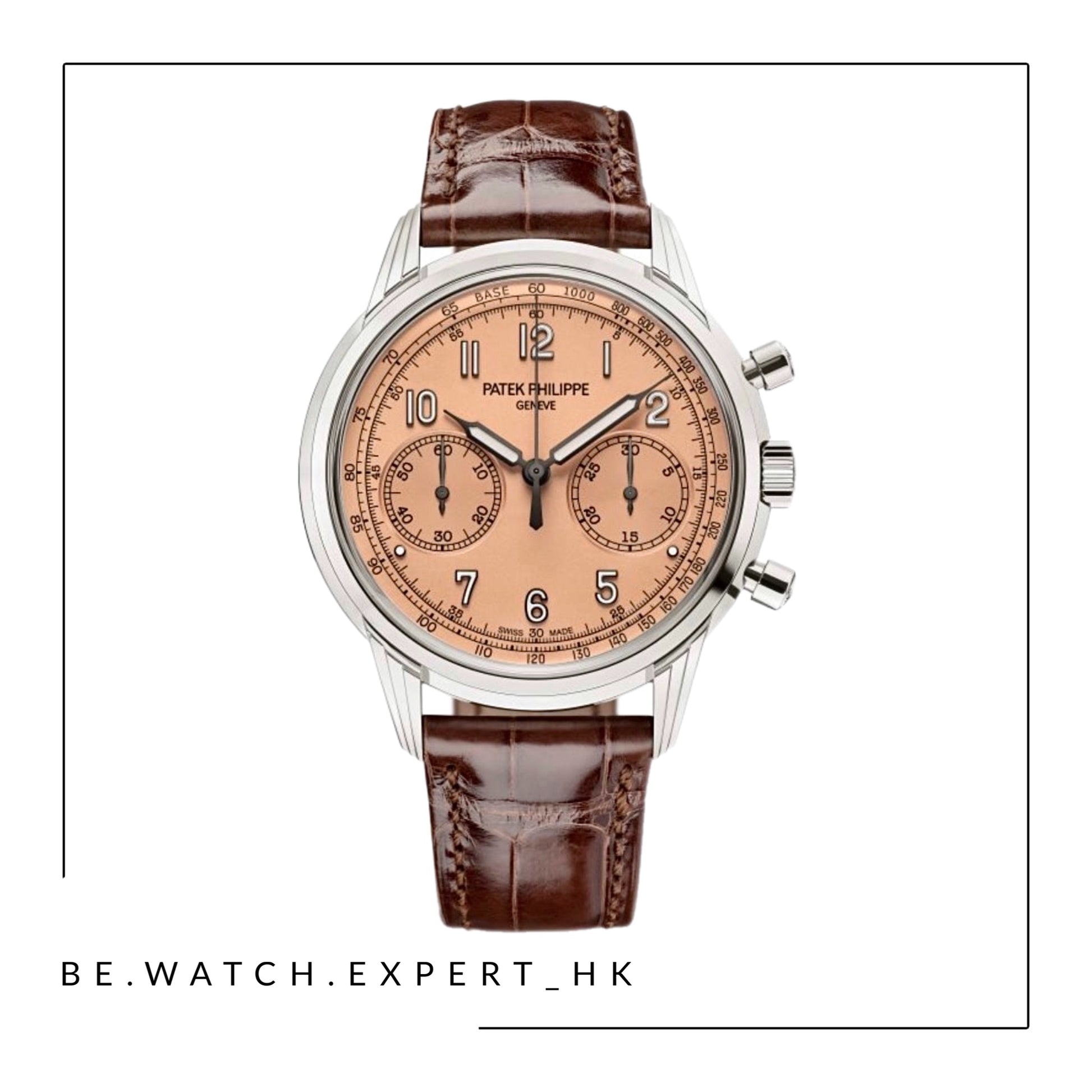 • Rose-gilt opaline dial, charcoal gray gold applied numerals with luminescent coating. Tachymeter scale