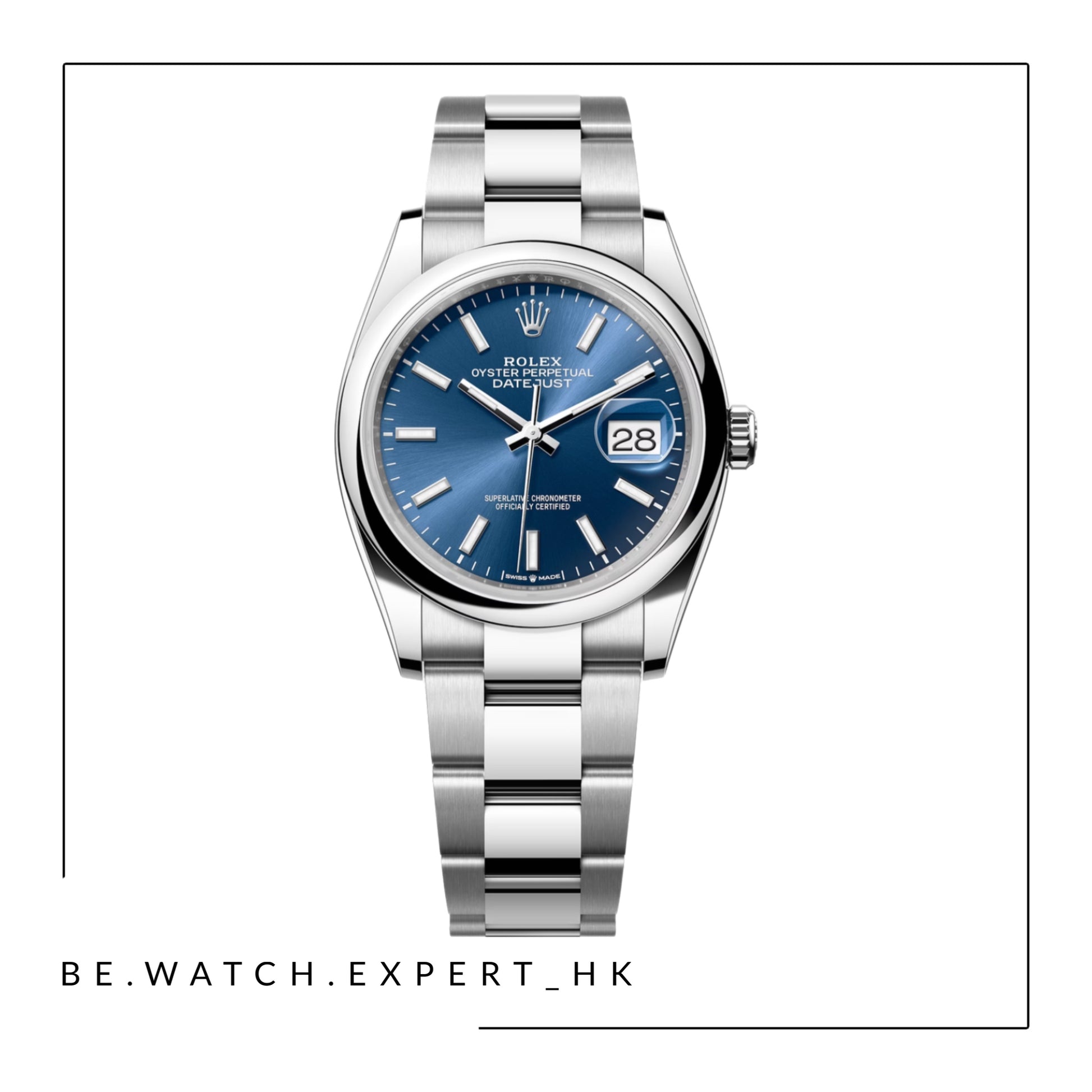 蠔式鋼款,搭配亮藍色錶面及蠔式(Oyster)錶帶