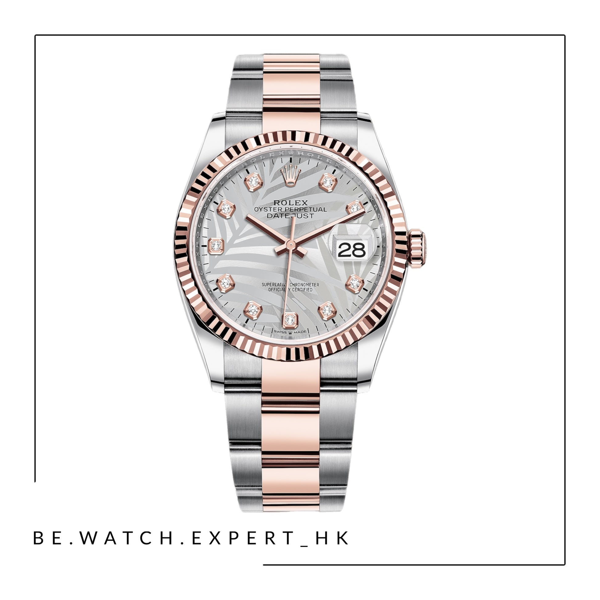 永恒玫瑰金及蠔式鋼款,搭配鑲鑽銀色棕櫚葉圖案錶面及蠔式錶帶