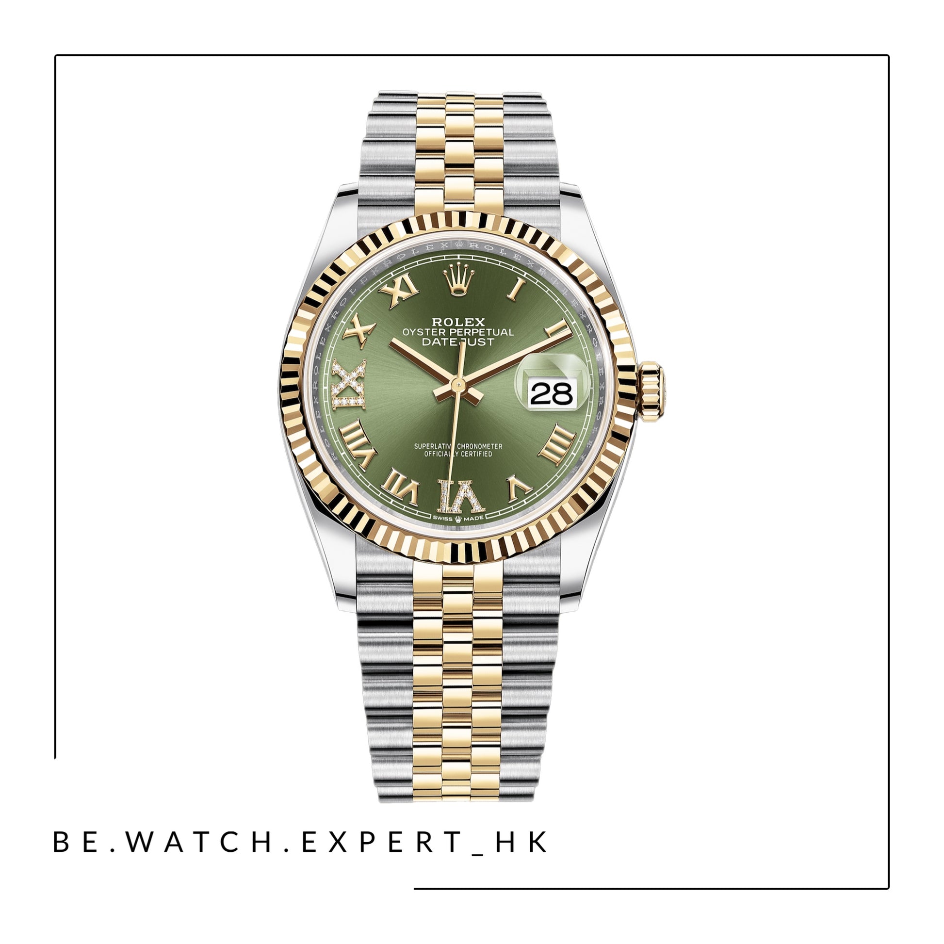 黃金及蠔式鋼款,搭配鑲鑽橄欖綠色錶面及紀念型(JUBILEE)錶帶