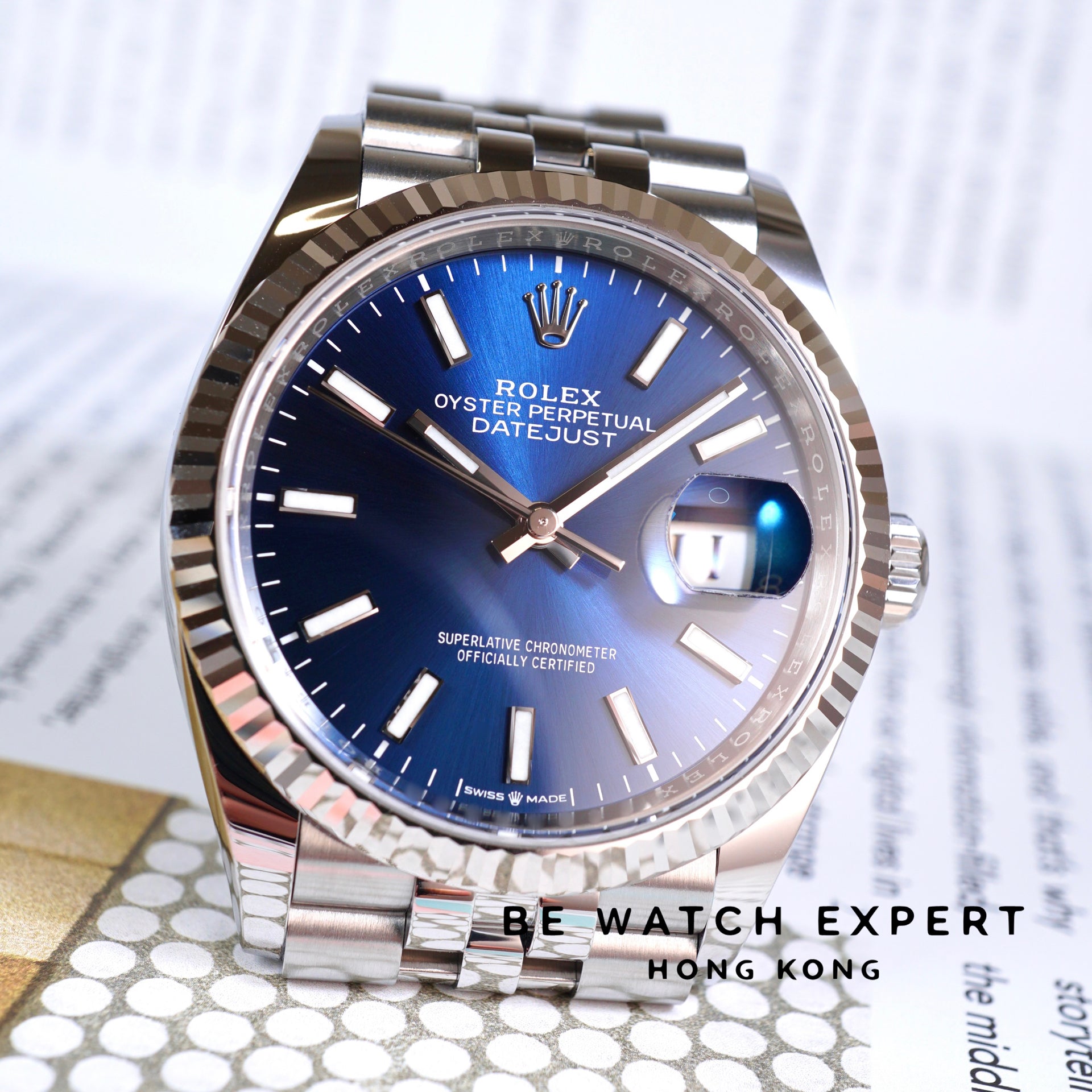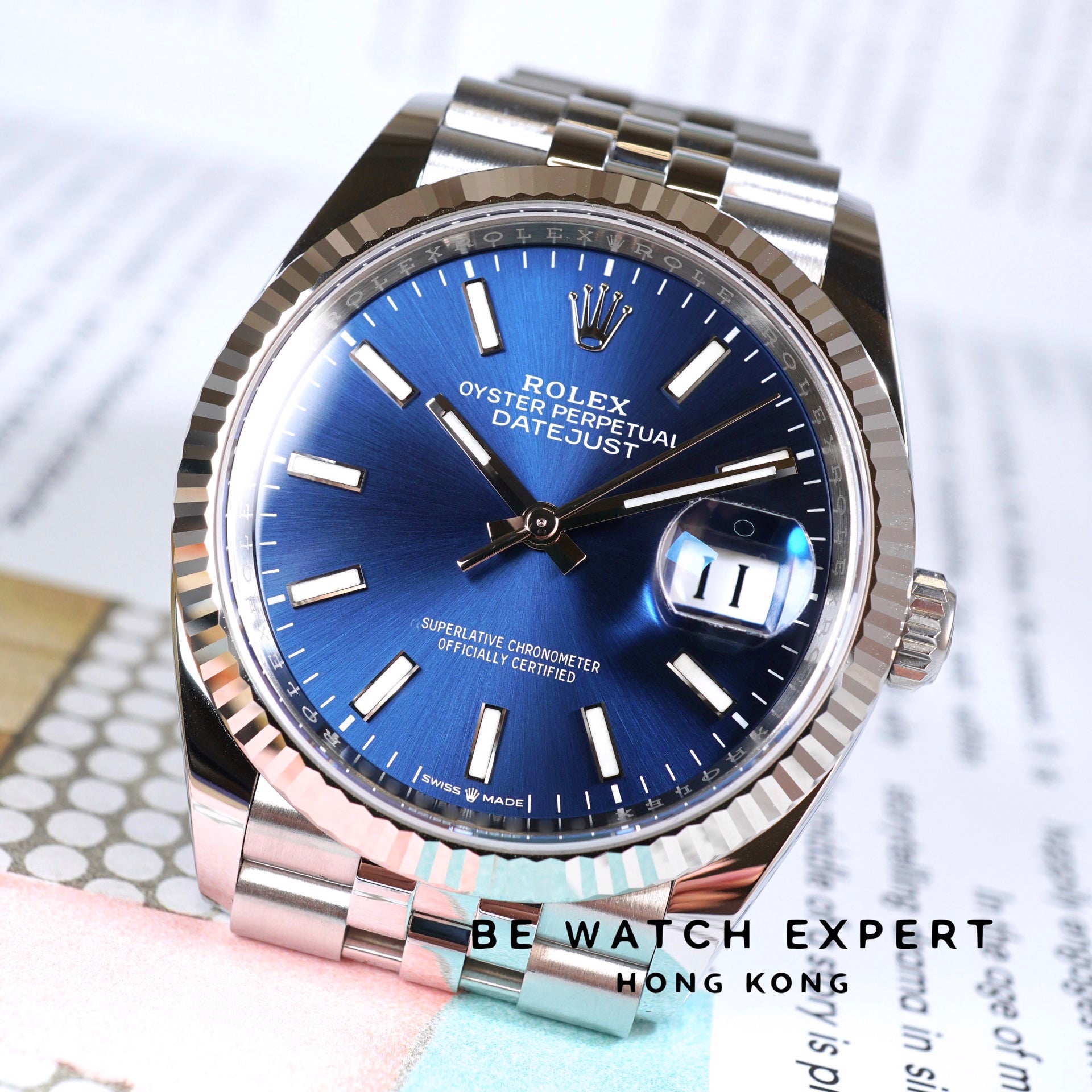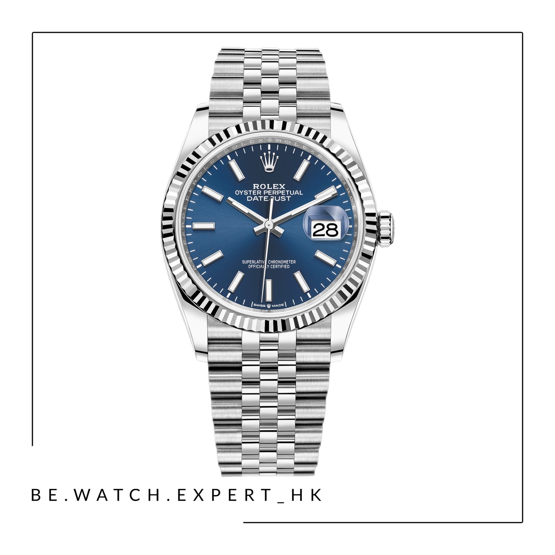白色黃金及蠔式鋼款,搭配亮藍色錶面及紀念型(JUBILEE)錶帶