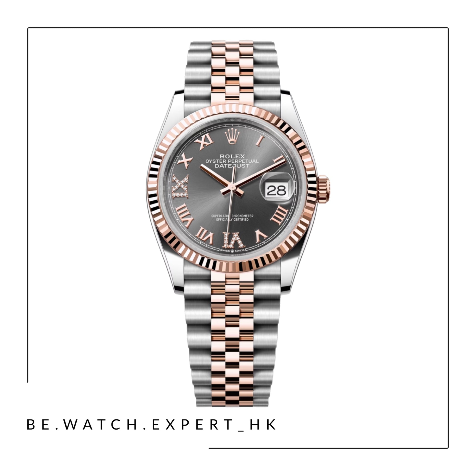 永恒玫瑰金及蠔式鋼款,搭配鑲鑽石板灰色錶面及紀念型(Jubilee)錶帶