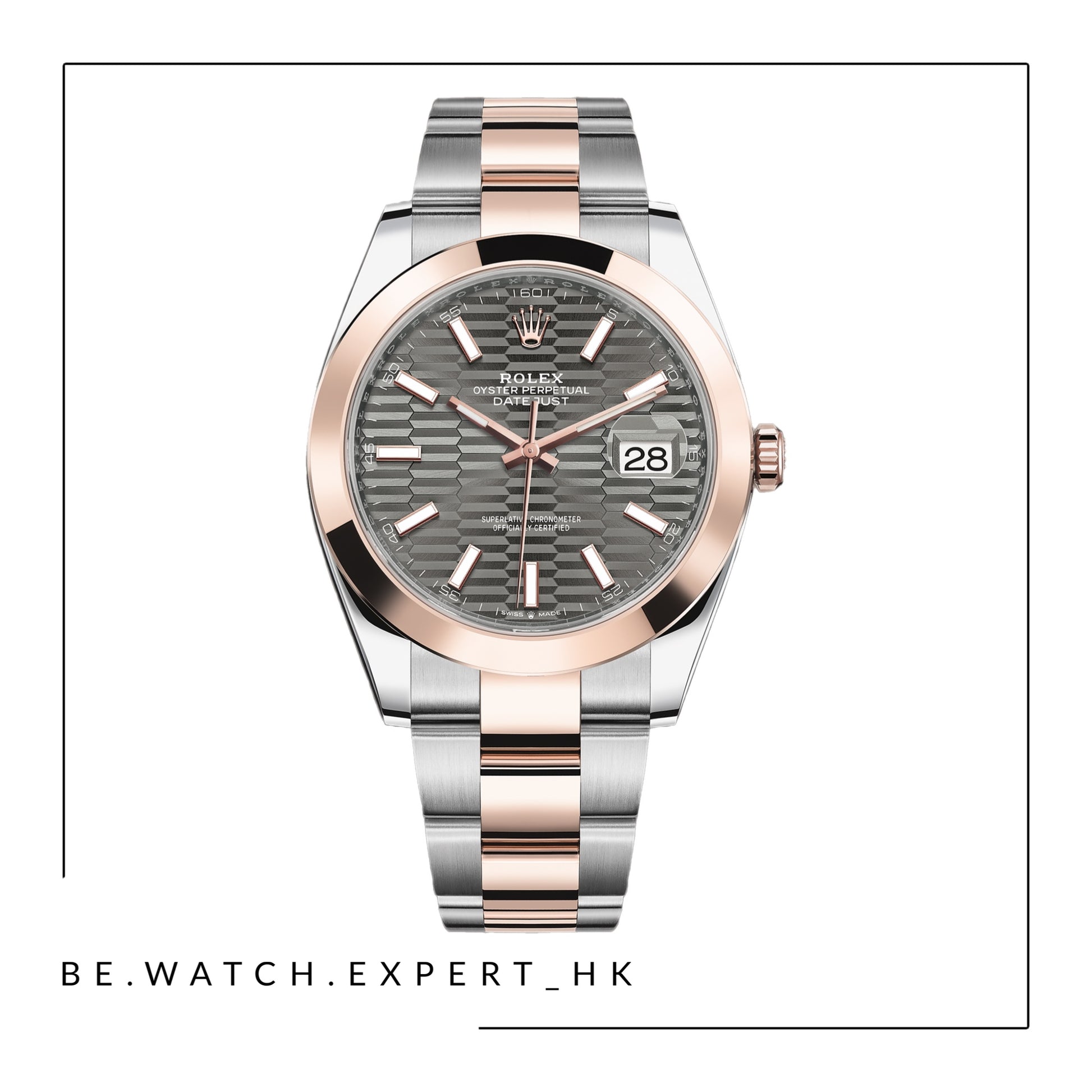 永恒玫瑰金及蠔式鋼款,搭配石板灰色坑紋圖案錶面及蠔式錶帶