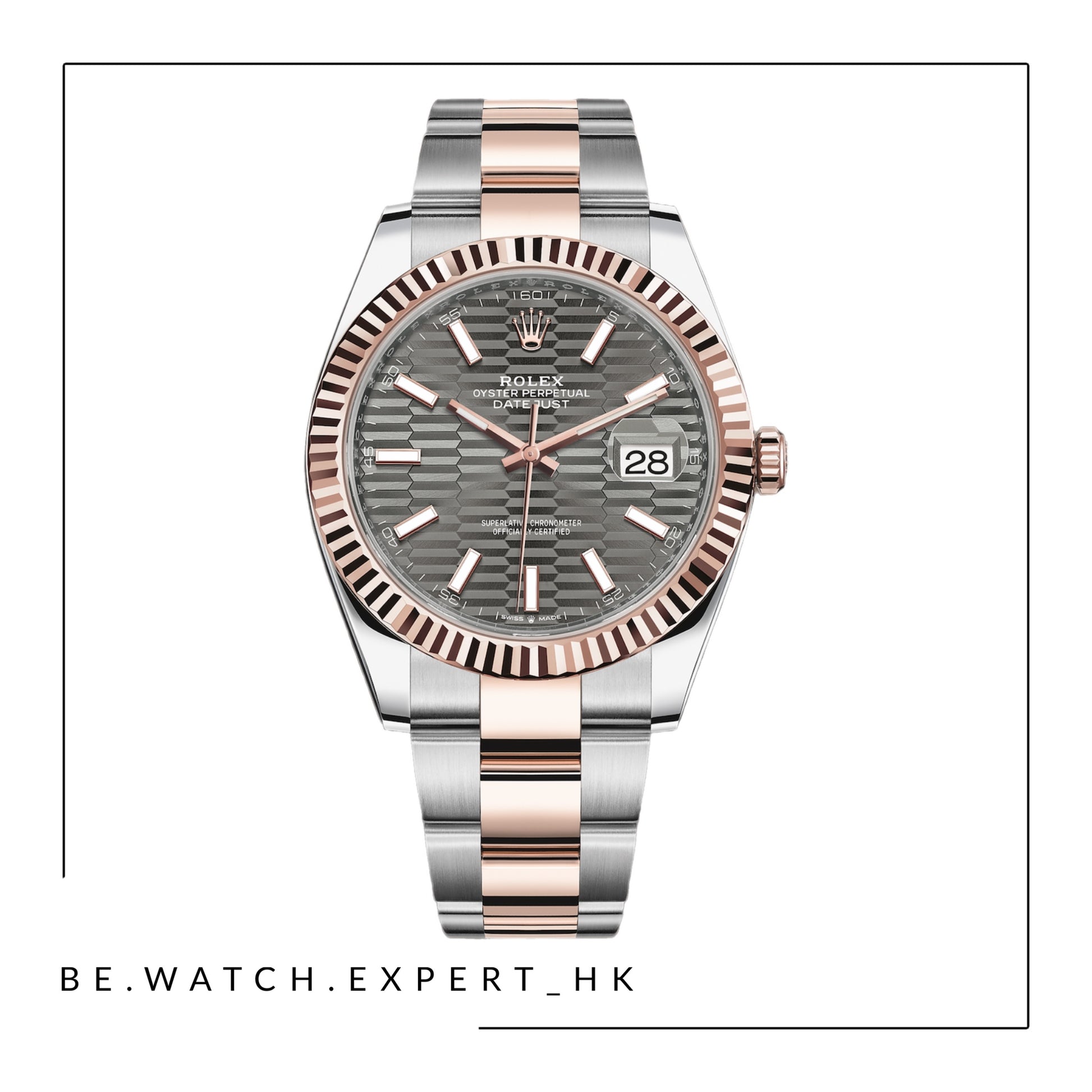 永恒玫瑰金及蠔式鋼款,搭配石板灰色坑紋圖案錶面及蠔式錶帶