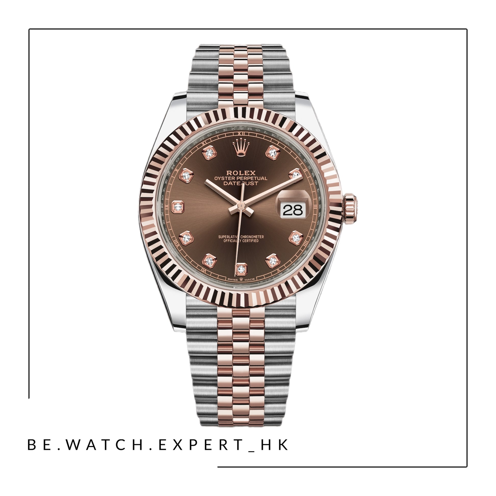 永恒玫瑰金及蠔式鋼款,搭配鑲鑽巧克力色錶面及紀念型(JUBILEE)錶帶