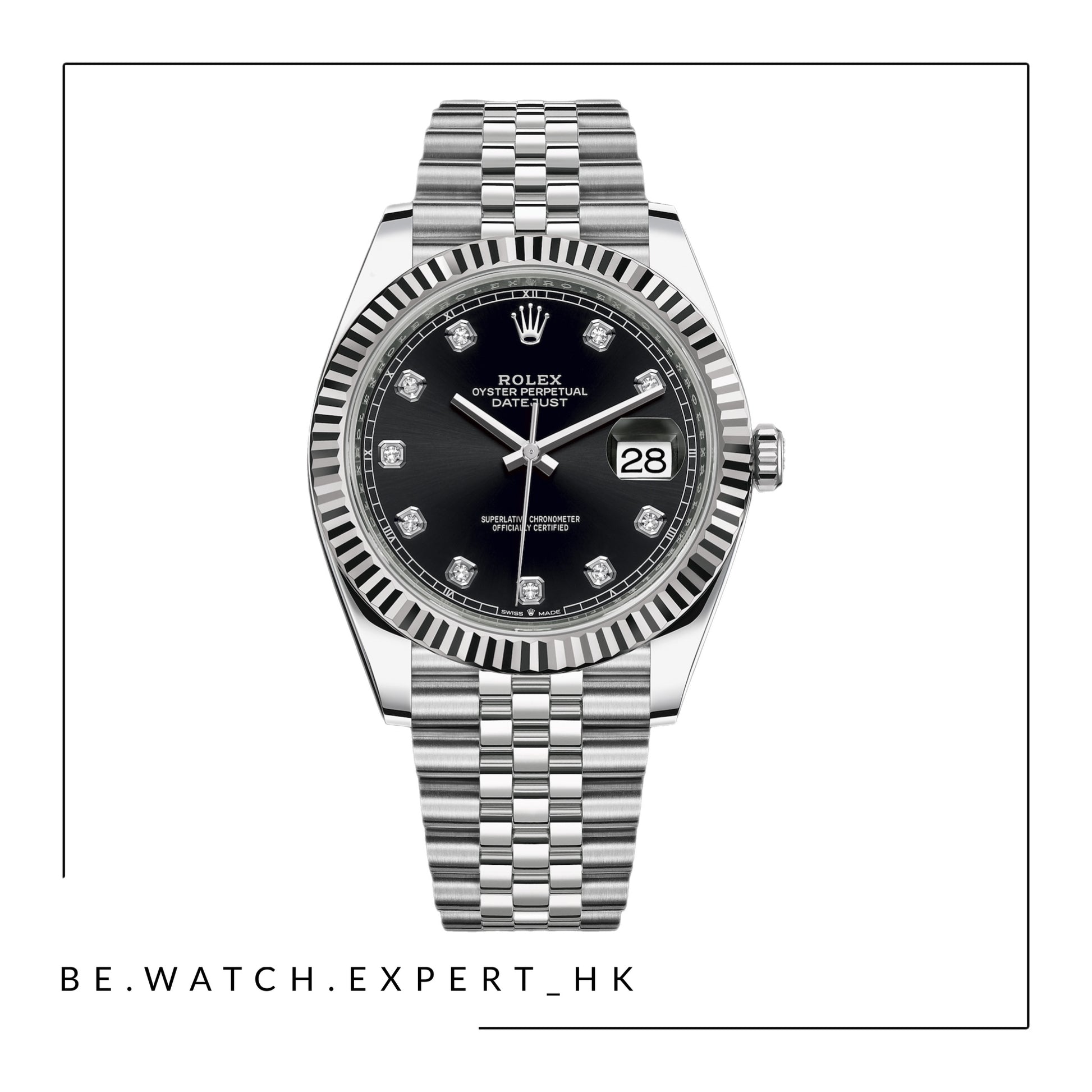 白色黃金及蠔式鋼款,搭配鑲鑽亮黑色錶面及紀念型 (JUBILEE)錶帶