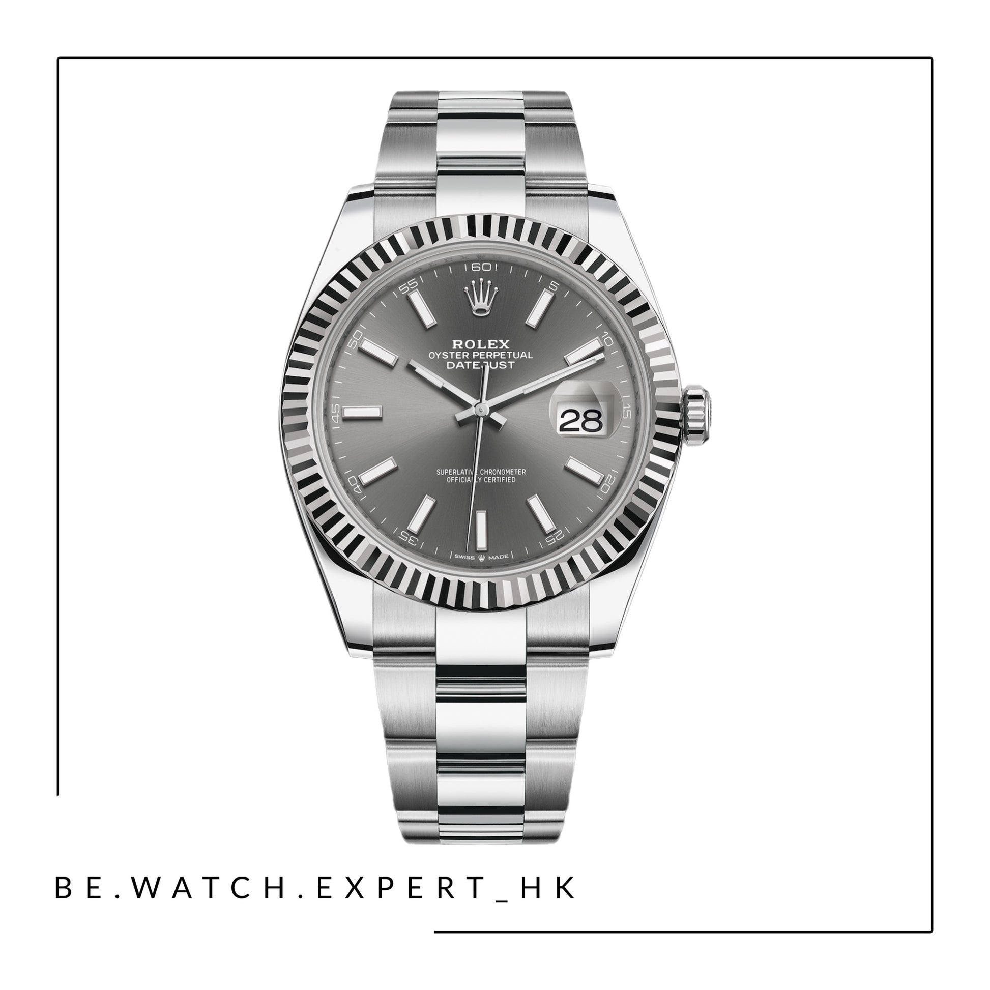 白色黃金及蠔式鋼款,搭配石板灰色錶面及蠔式錶帶