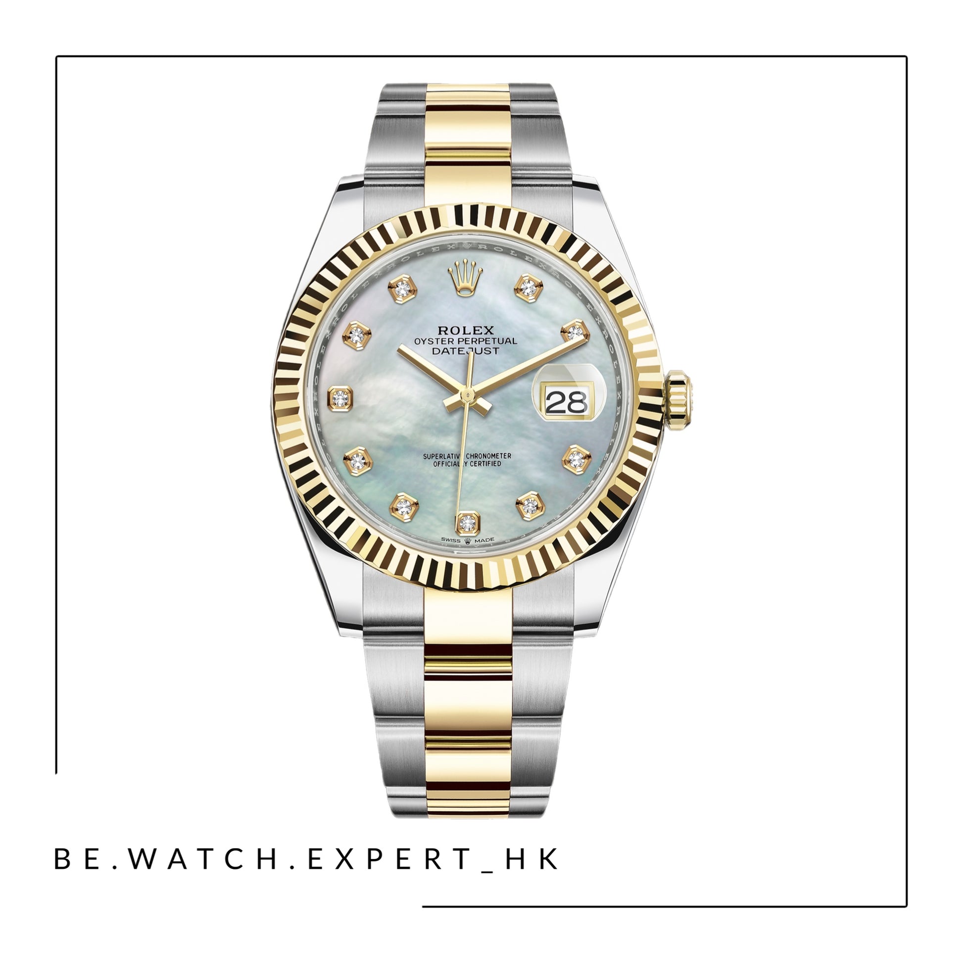 黃金及蠔式鋼款,搭配鑲鑽白色珍珠母錶面及蠔式錶帶