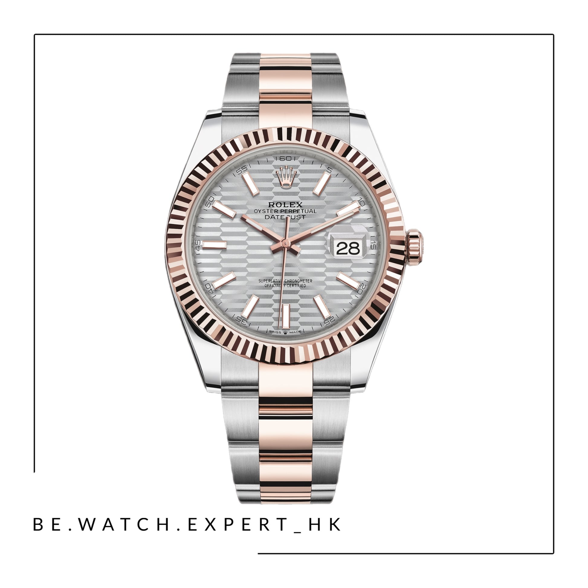 永恒玫瑰金及蠔式鋼款,搭配銀色坑紋圖案錶面及蠔式錶帶