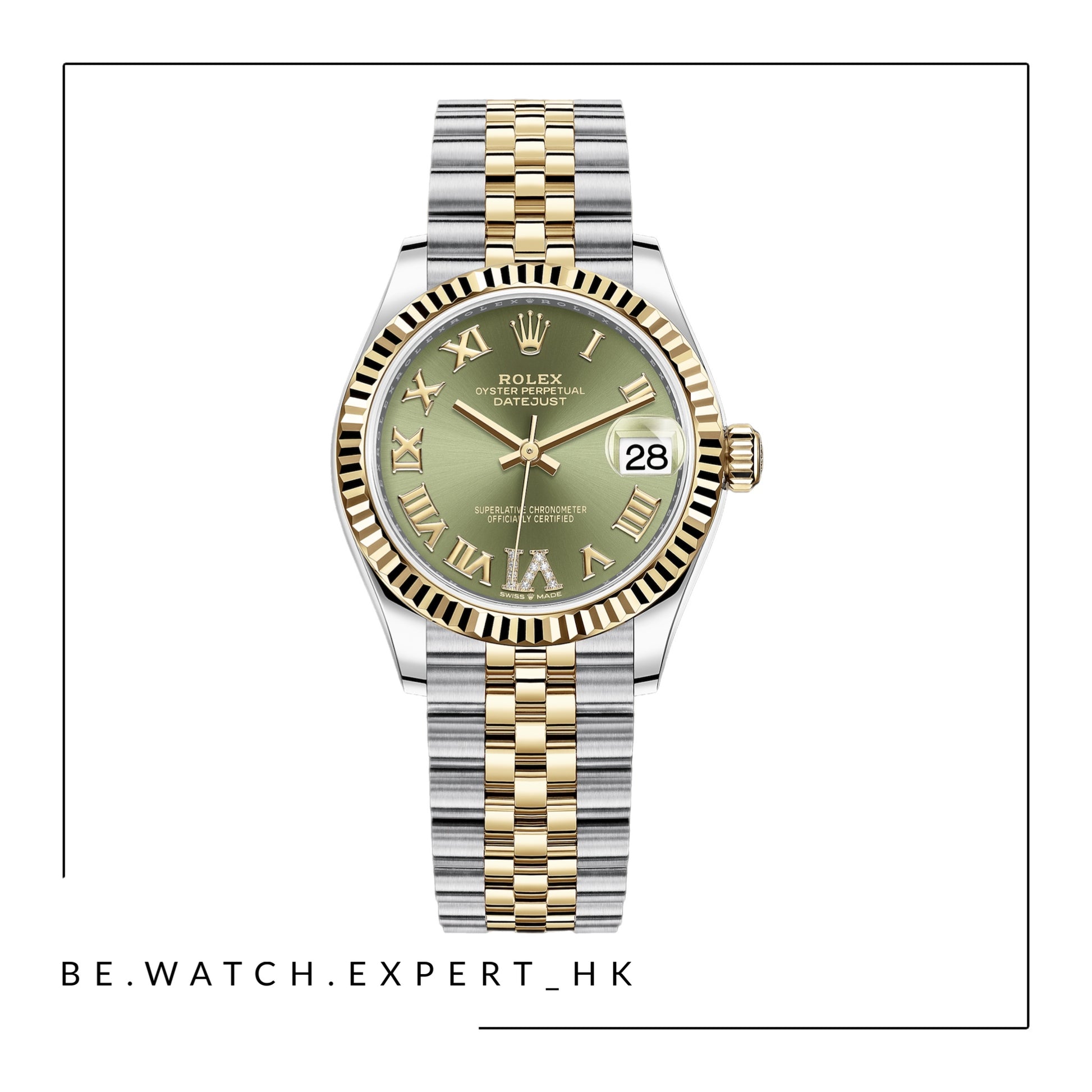 黃金及蠔式鋼款,搭配鑲鑽橄欖綠色錶面及紀念型(JUBILEE)錶帶,錶面設有鑲鑽特大羅馬數字VI