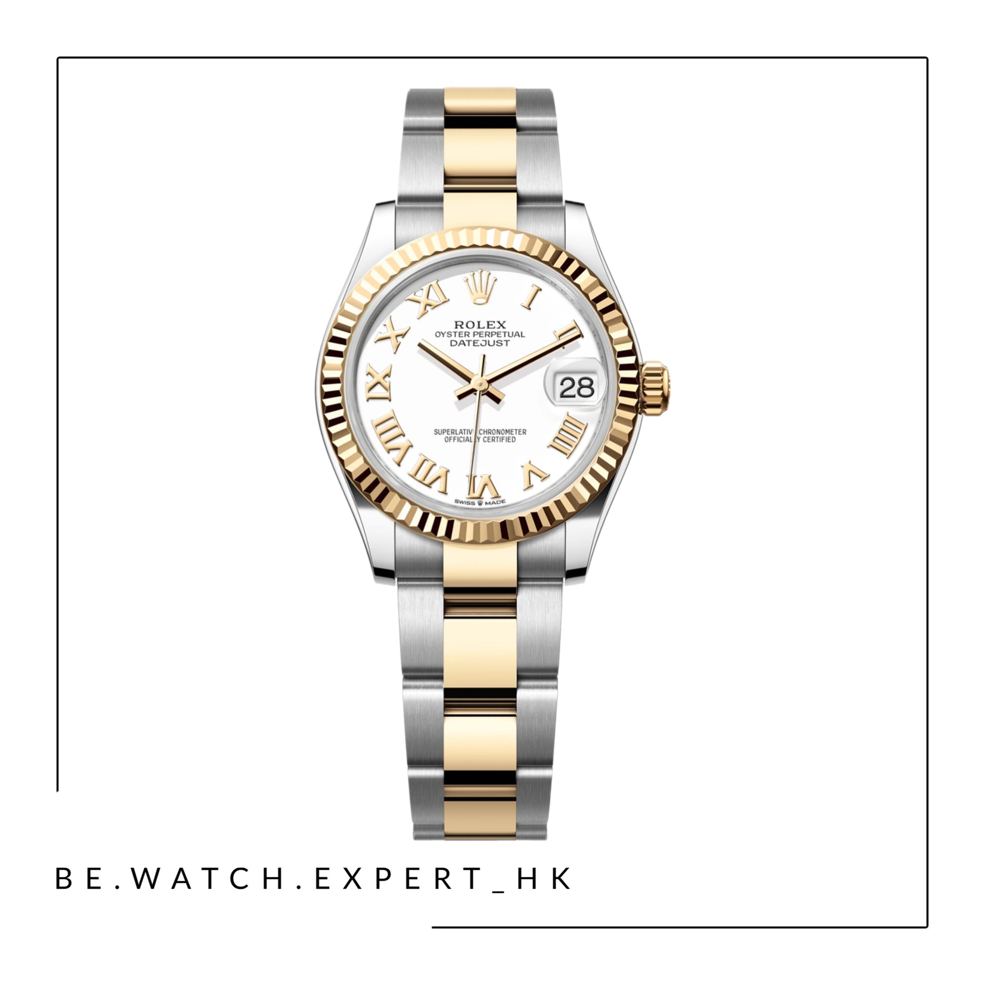 黃金及蠔式鋼款,搭配白色錶面及蠔式(Oyster)錶帶