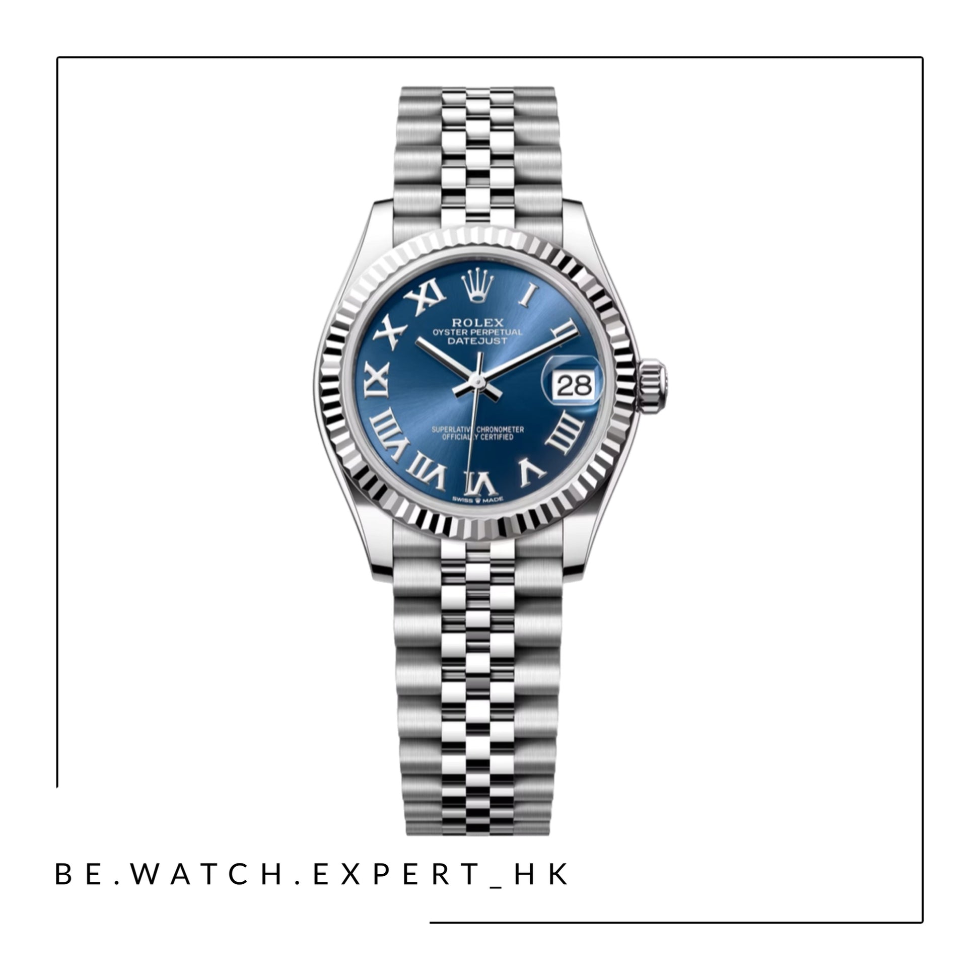 白色黃金及蠔式鋼款,搭配亮藍色錶面及紀念型(Jubilee)錶帶