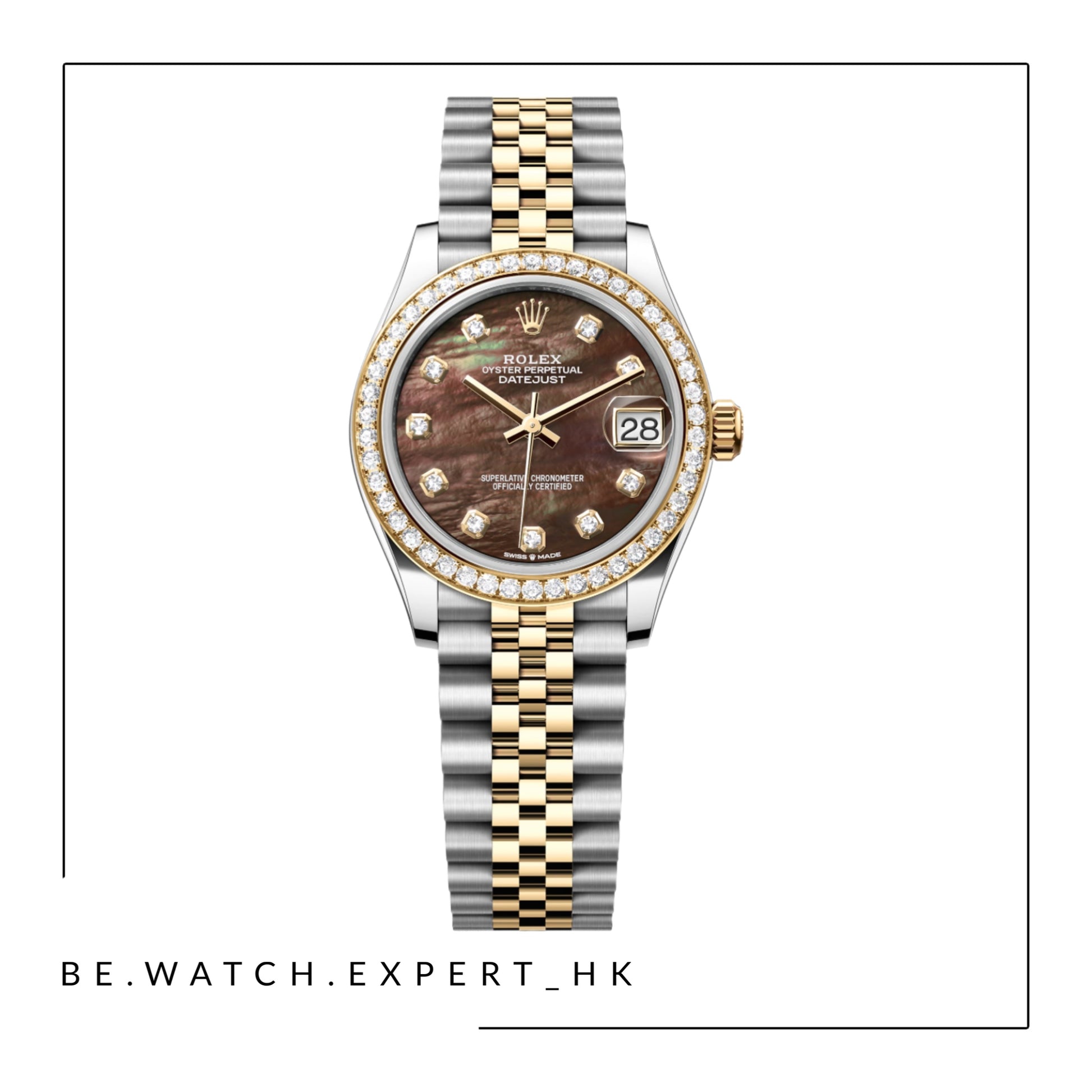 黃金及蠔式鋼款,搭配鑲鑽黑色珍珠母錶面及紀念型(Jubilee)錶帶