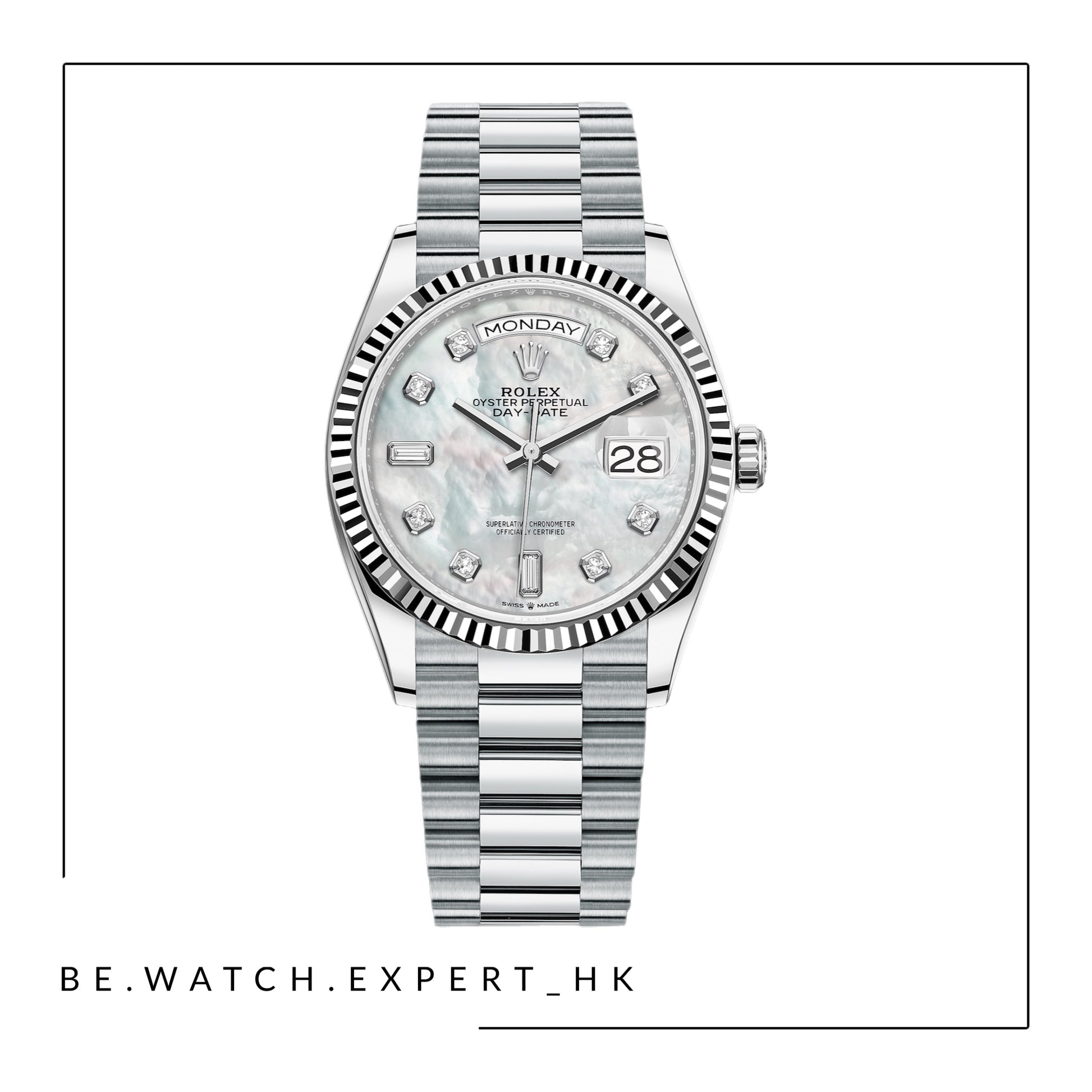 鉑金款,搭配鑲鑽白色珍珠母錶面、三角坑紋外圈及元首型(PRESIDENT)錶帶
