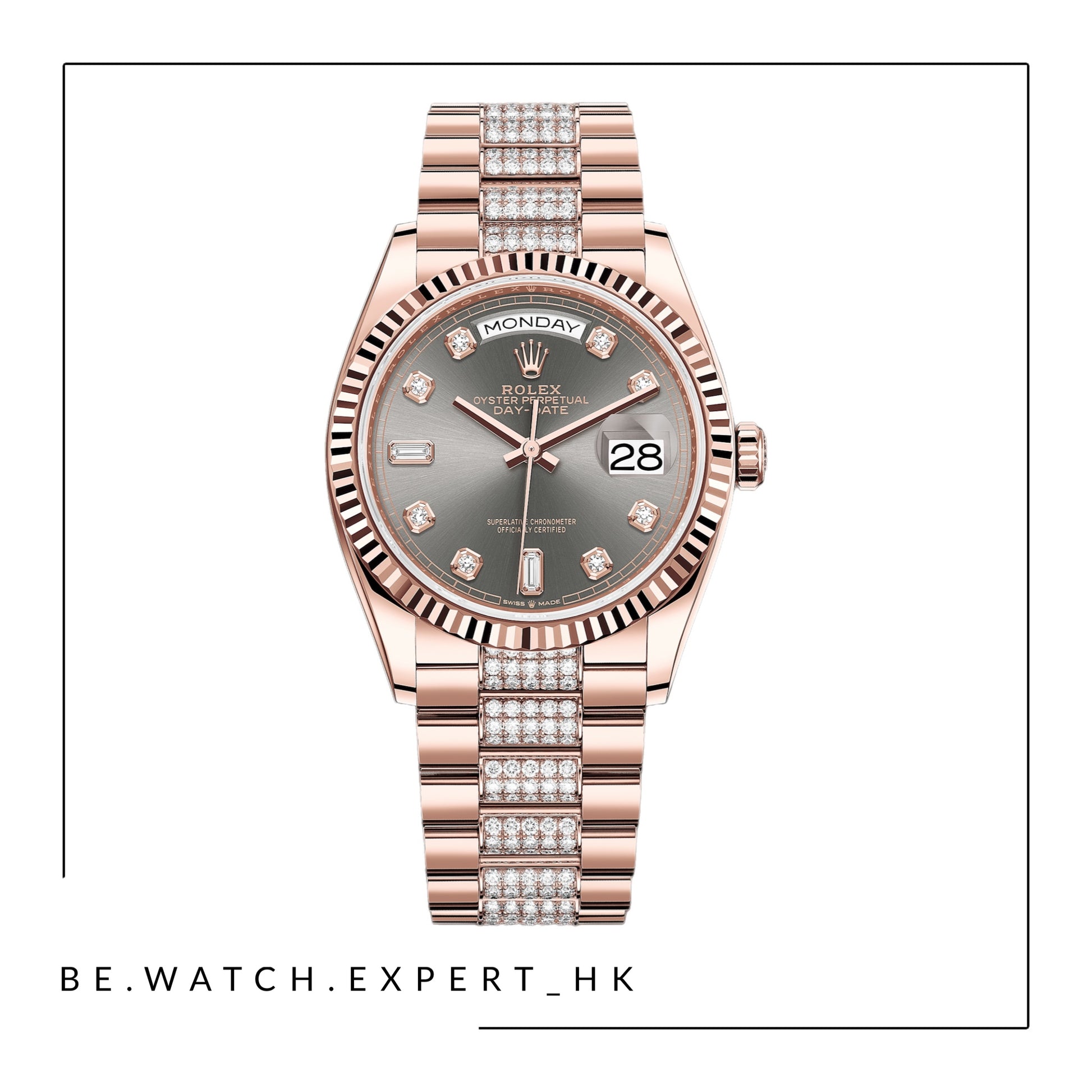 18K永恒玫瑰金款,搭配鑲鑽石板灰色錶面、三角坑紋外圈及鑲鑽元首型(PRESIDENT)錶帶