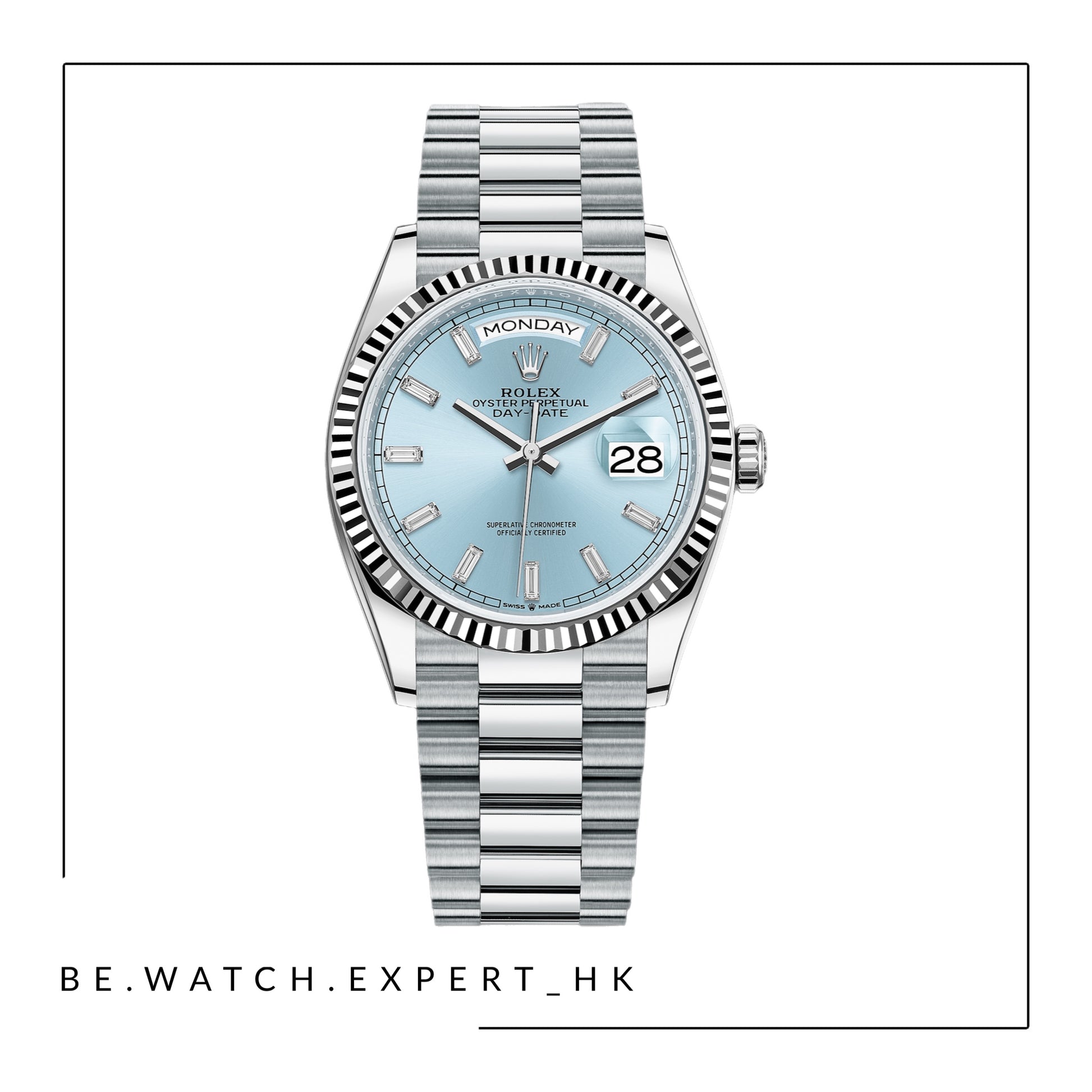 鉑金款,搭配鑲鑽冰藍色錶面、三角坑紋外圈及元首型(PRESIDENT)錶帶