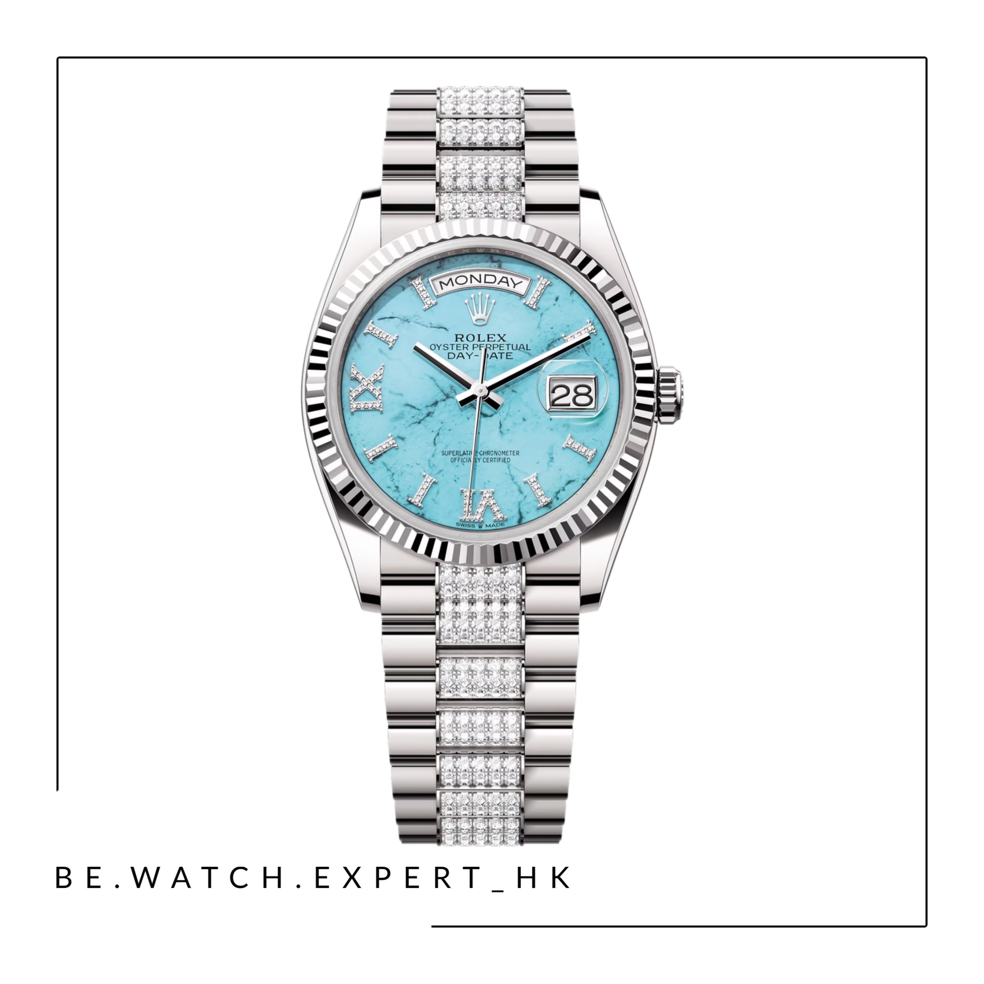 18K白色黃金款,搭配鑲鑽綠松石錶面、三角坑紋外圈及鑲鑽元首型(President)錶帶