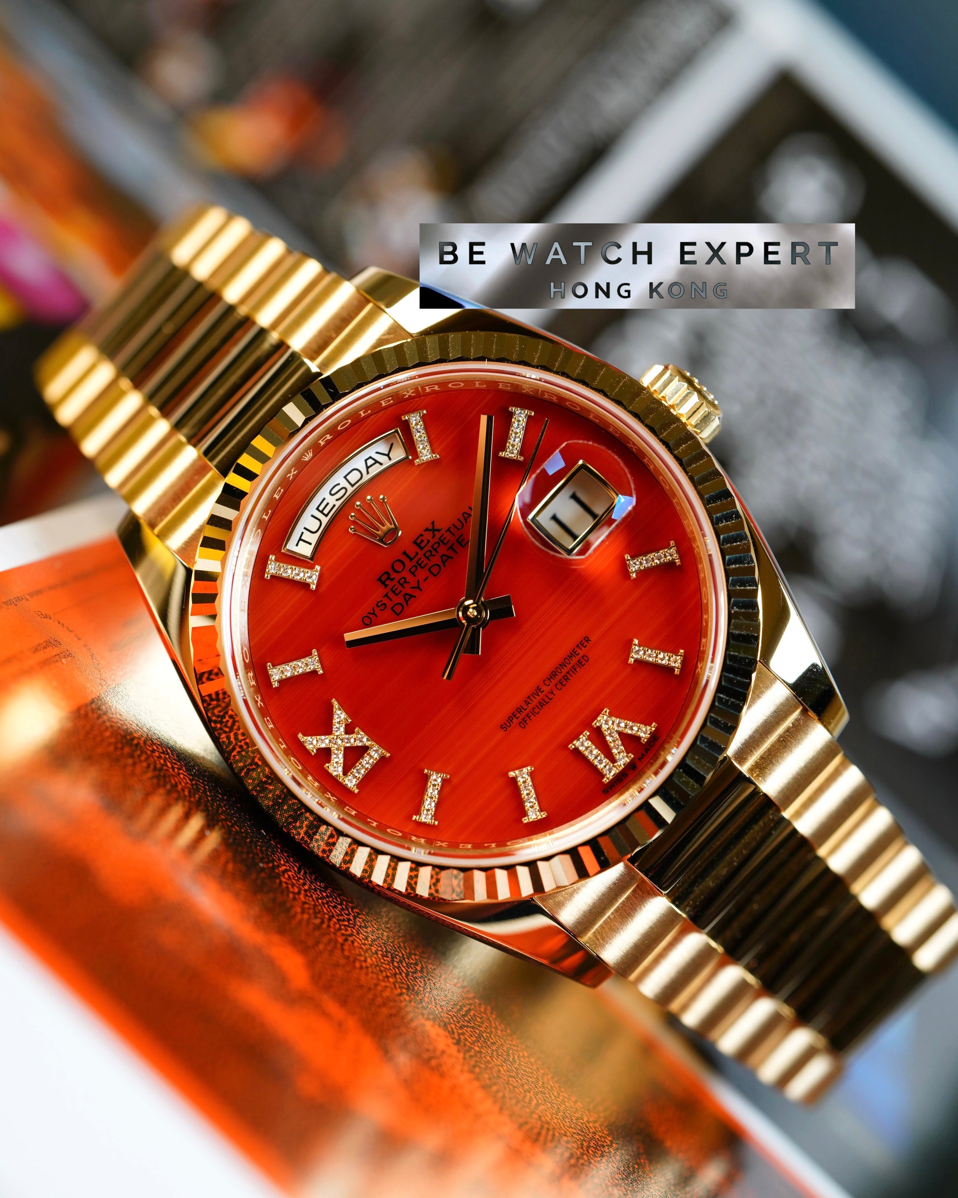 18K黃金款,搭配鑲鑽紅玉髓錶面、三角坑紋外圈及元首型(President)錶帶
