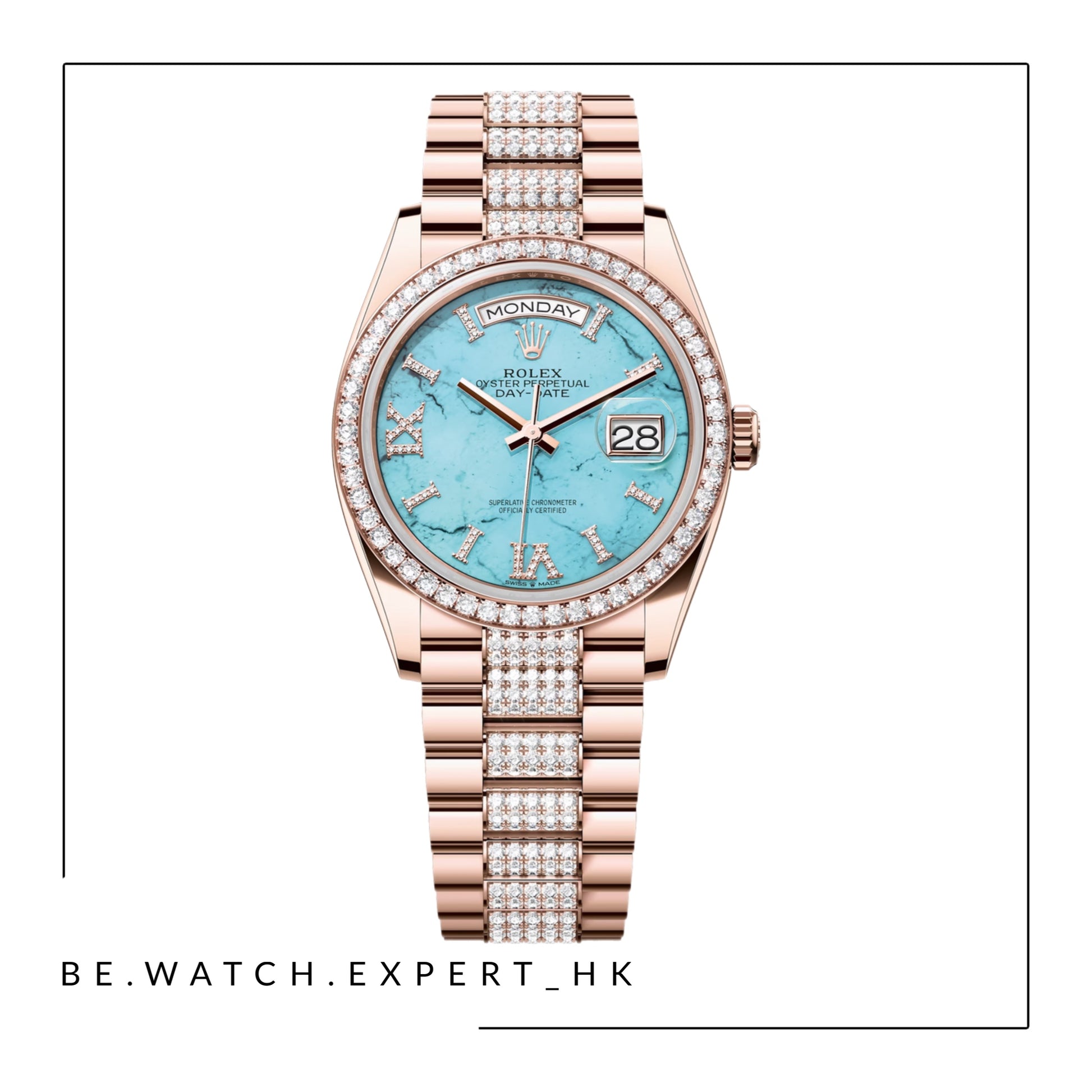 18K永恒玫瑰金款,搭配鑲鑽綠松石錶面、鑲鑽石外圈及鑲鑽元首型(President)錶帶