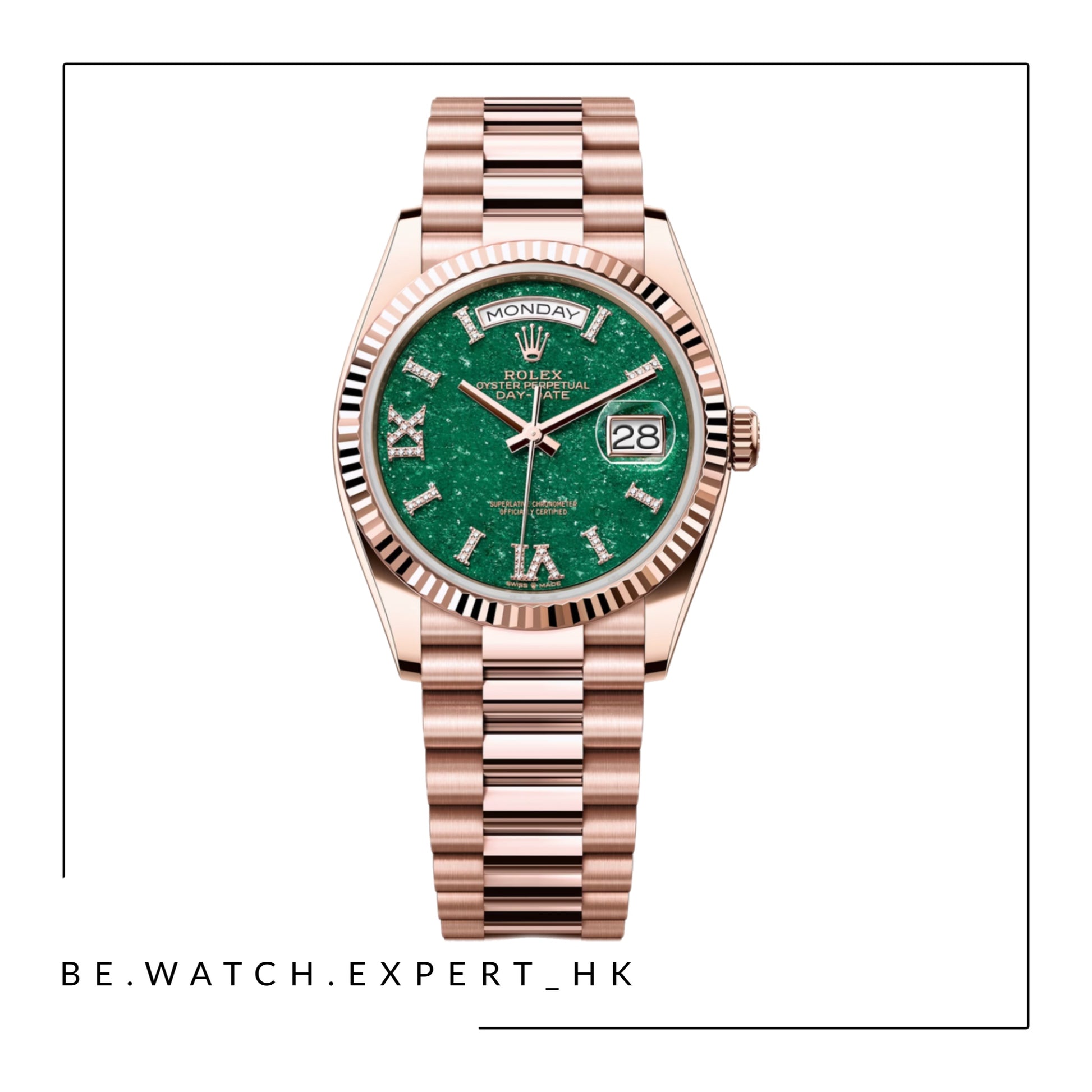 18K永恒玫瑰金款,搭配鑲鑽綠色砂金石錶面、三角坑紋外圈及元首型(President)錶帶