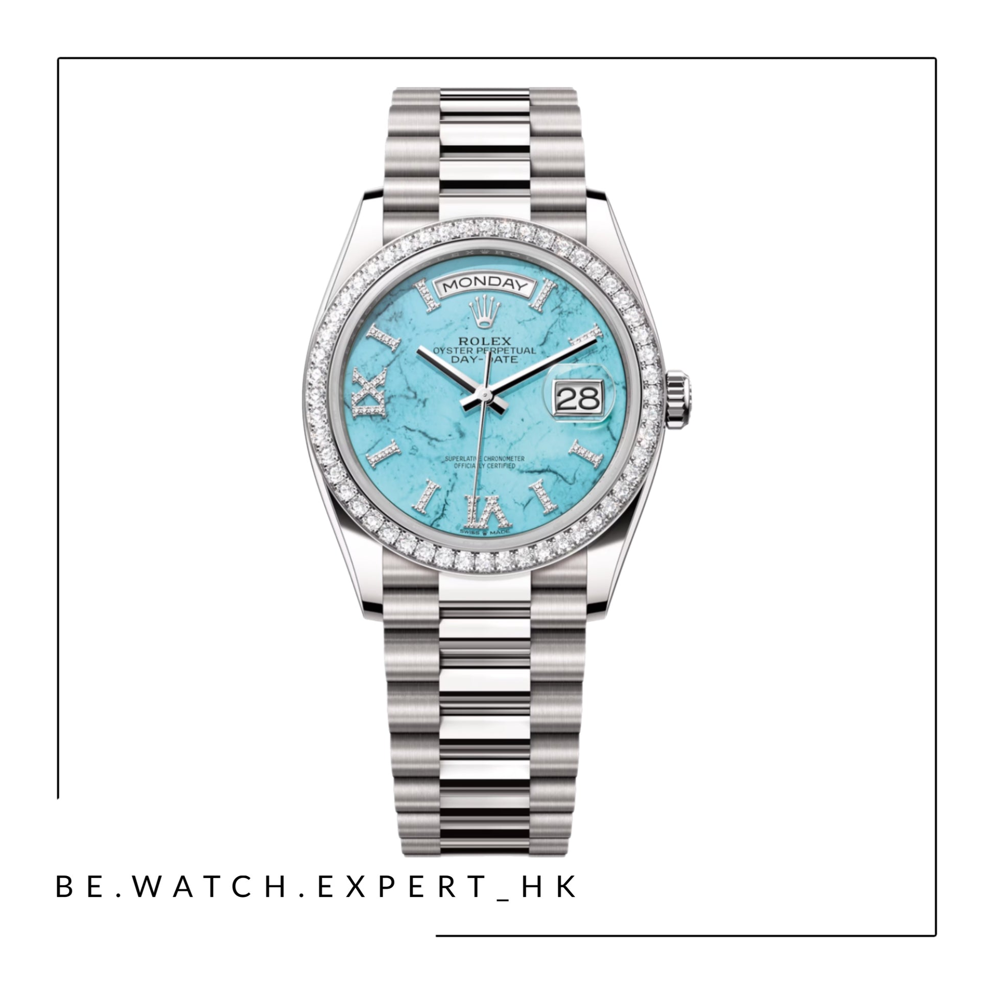 18K白色黃金款,搭配鑲鑽綠松石錶面、鑲鑽石外圈及元首型(President)錶帶