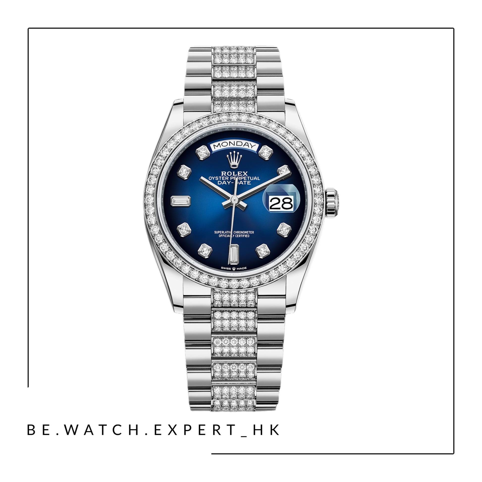 18K白色黃金款,搭配鑲鑽漸變藍色錶面、鑲鑽石外圈及鑲鑽元首型(PRESIDENT)錶帶