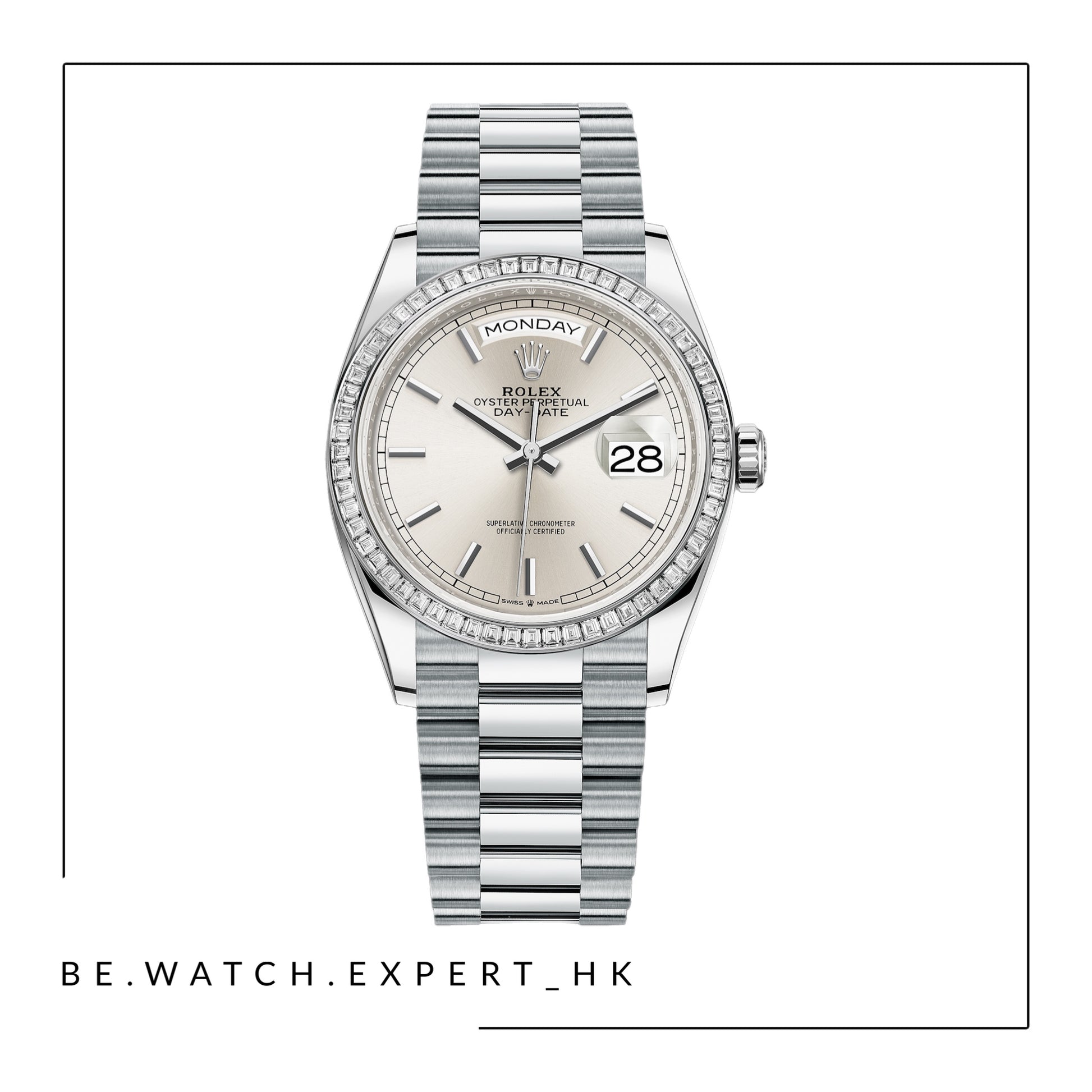 鉑金款,搭配銀色錶面、鑲鑽石外圈及元首型(PRESIDENT)錶帶