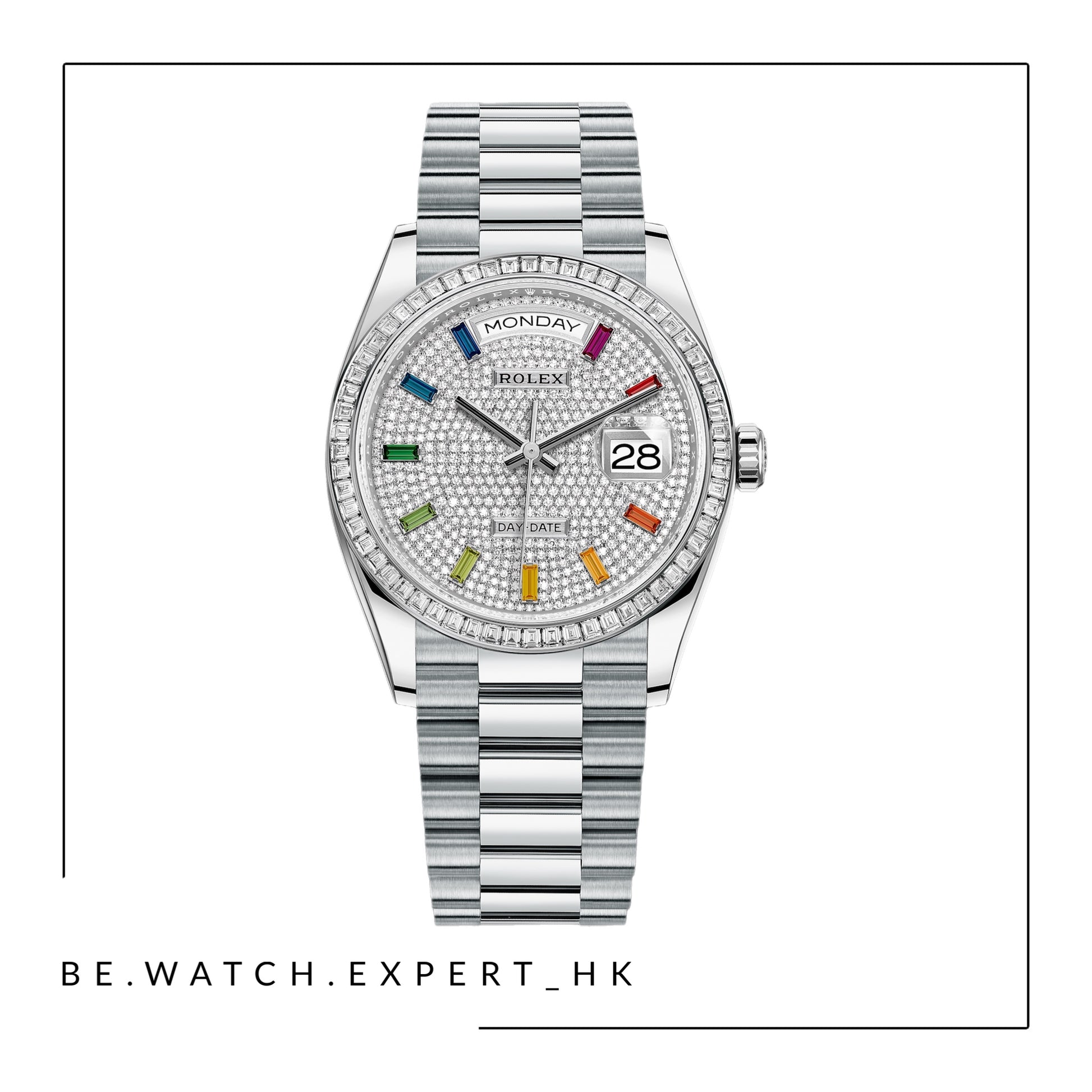 鉑金款,搭配密鑲鑽石錶面、鑲鑽石外圈及元首型(PRESIDENT)錶帶