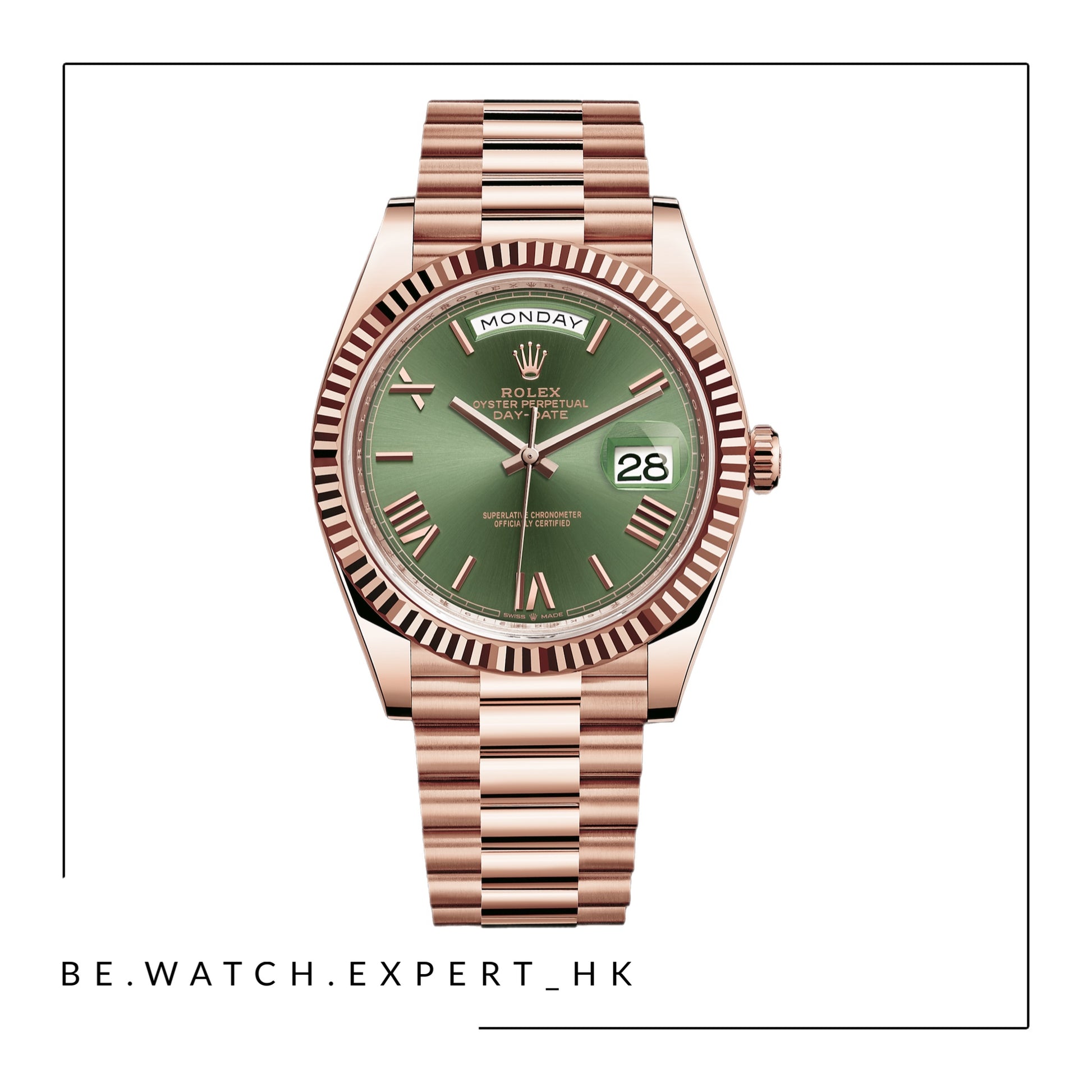 18K永恒玫瑰金款,搭配橄欖綠色錶面、三角坑紋外圈及元首型(PRESIDENT)錶帶