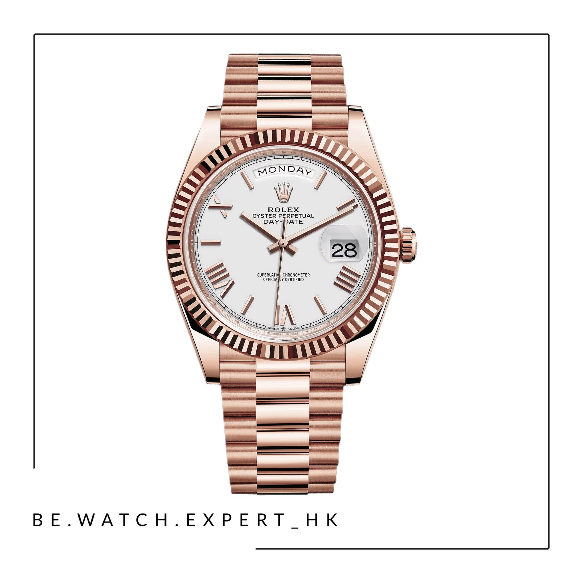 18K永恒玫瑰金款,搭配白色錶面、三角坑紋外圈及元首型(PRESIDENT)錶帶