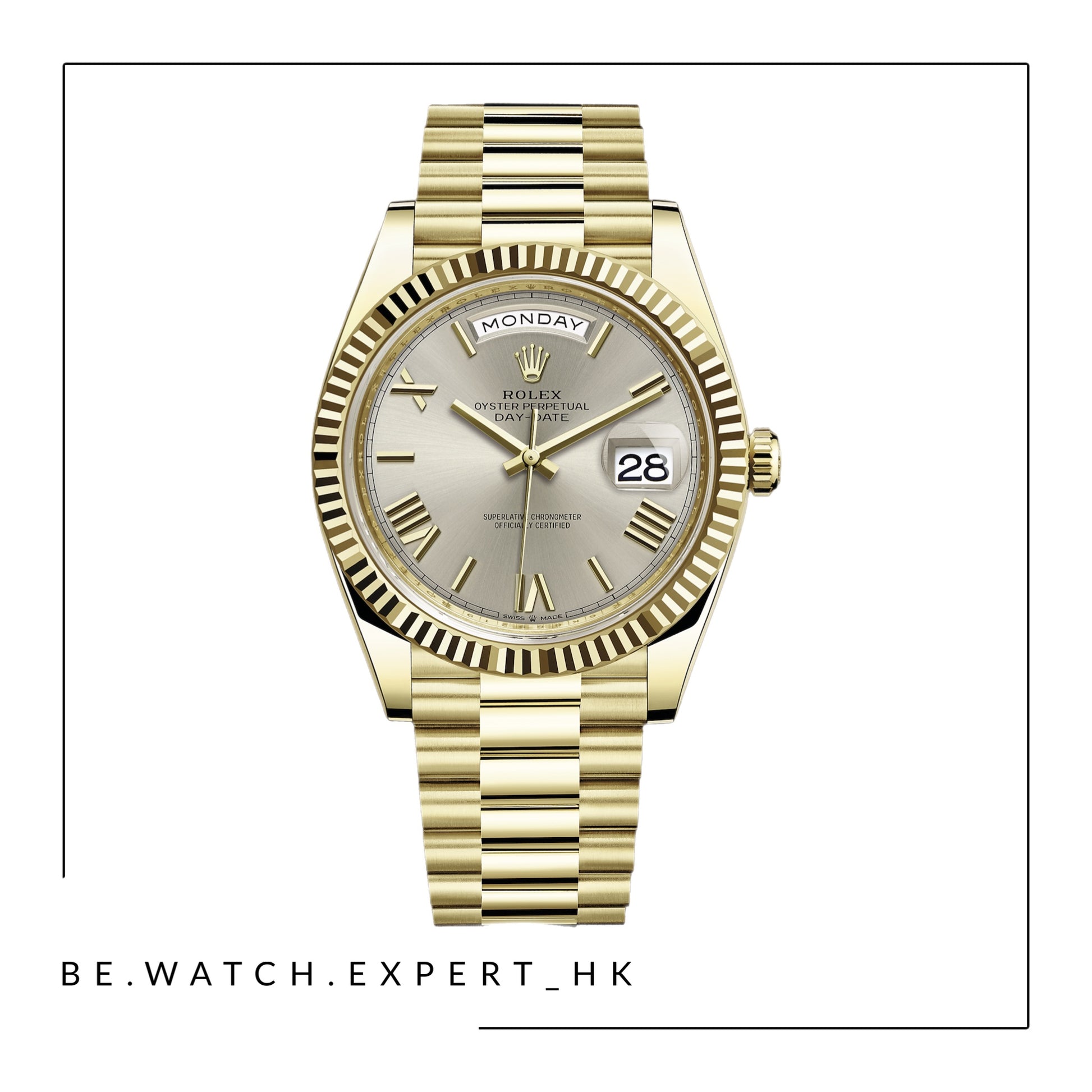 18K黃金款,搭配銀色錶面、三角坑紋外圈及元首型(PRESIDENT)錶帶