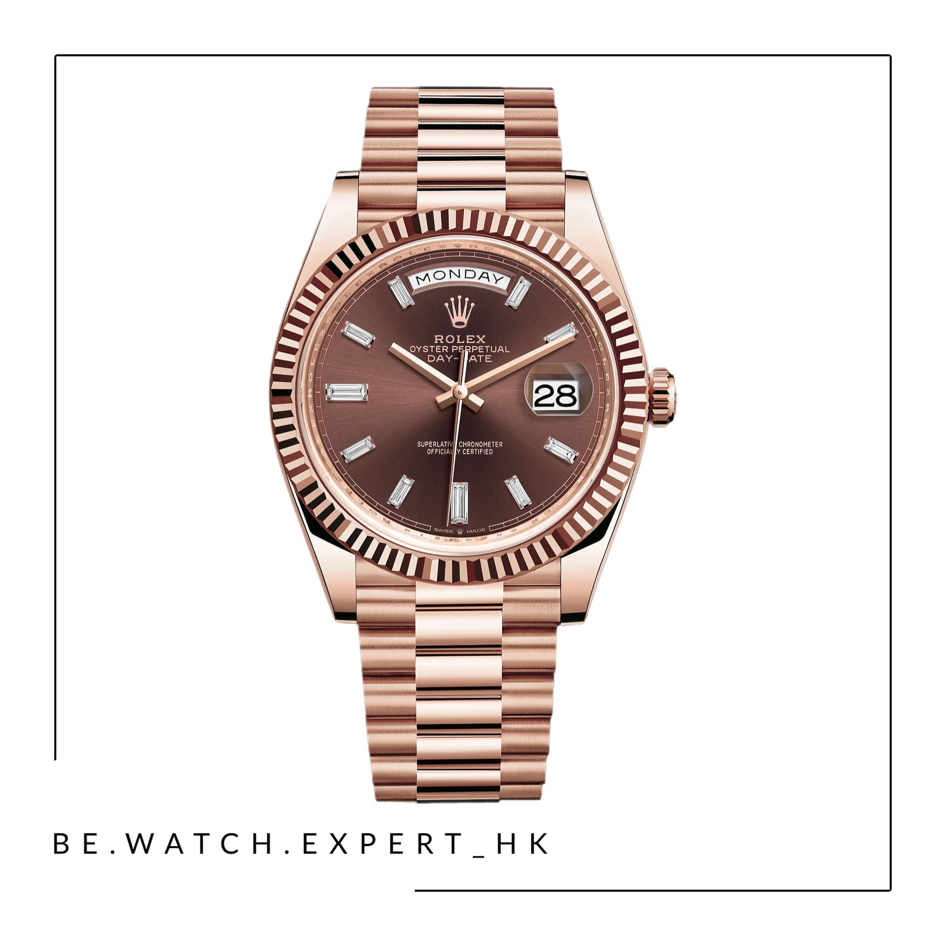 18K永恒玫瑰金款,搭配鑲鑽巧克力色錶面、三角坑紋外圈及元首型(PRESIDENT)錶帶