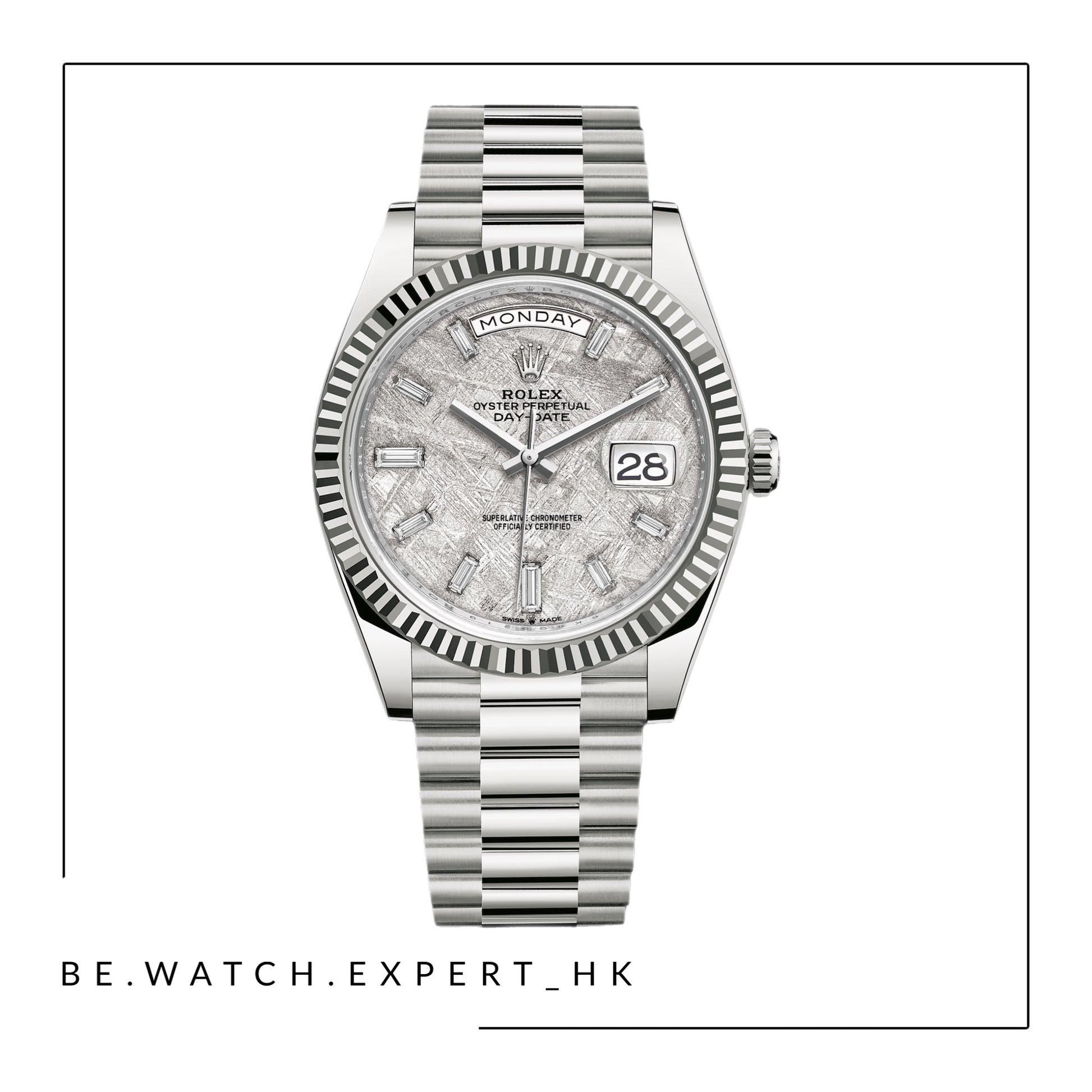 白色黃金款,搭配鑲鑽隕石錶面、三角坑紋外圈及元首型(PRESIDENT)錶帶