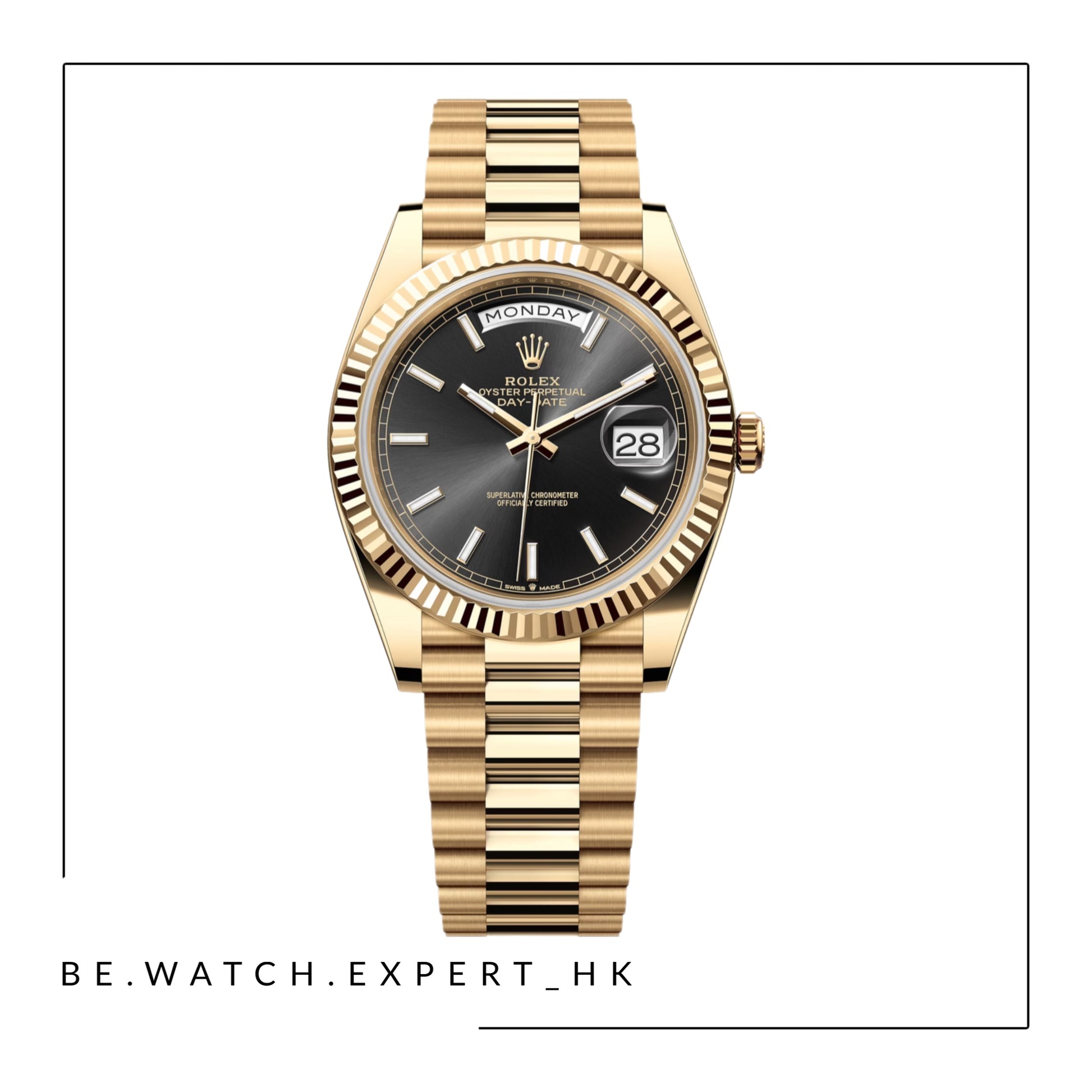 18K黃金款,搭配亮黑色錶面、三角坑紋外圈及元首型(President)錶帶