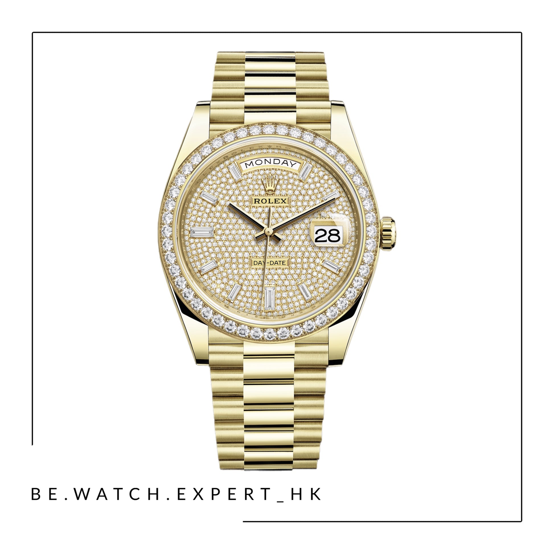 18K黃金款,搭配密鑲鑽石錶面、鑲鑽石外圈及元首型(PRESIDENT)錶帶