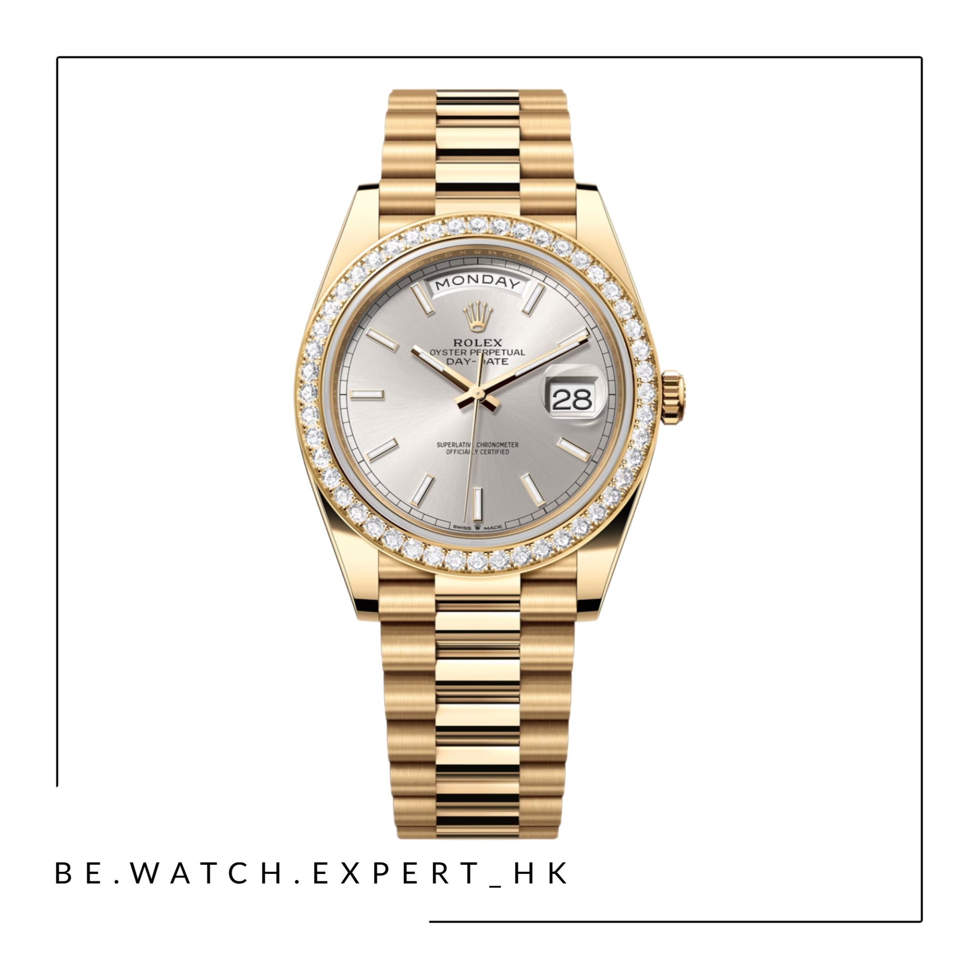 18K黃金款,搭配銀色錶面、鑲鑽石外圈及元首型(President)錶帶