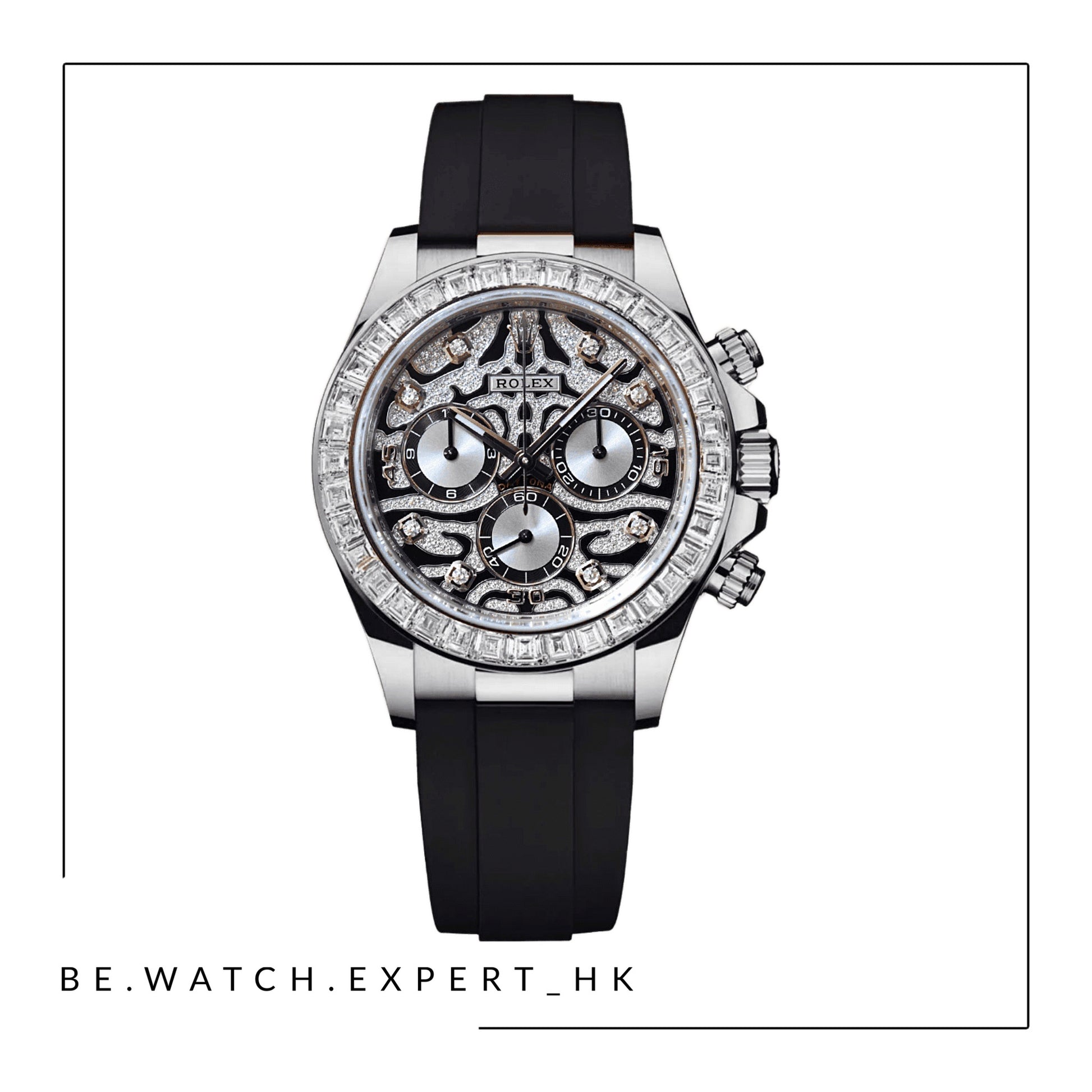 18K白金款,黑色漆藝面盤搭配鑲鑽錶圈以及Oysterflex錶帶