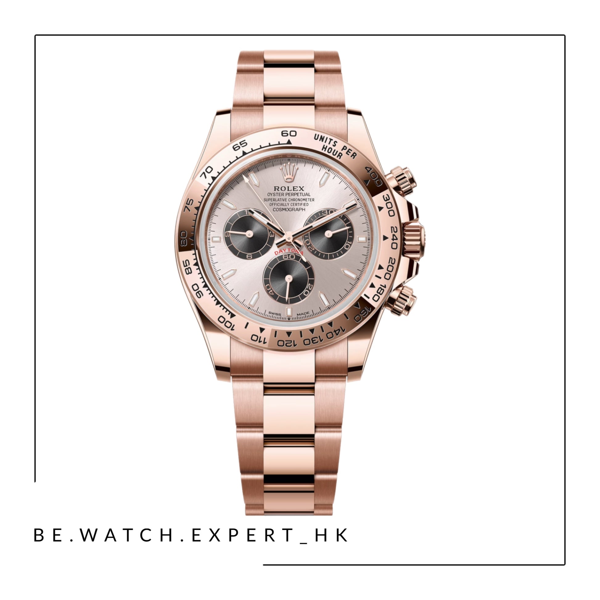 18K永恒玫瑰金款,搭配日亮金色及亮黑色錶面及蠔式(Oyster)錶帶,18K永恒玫瑰金外圈刻有測速計