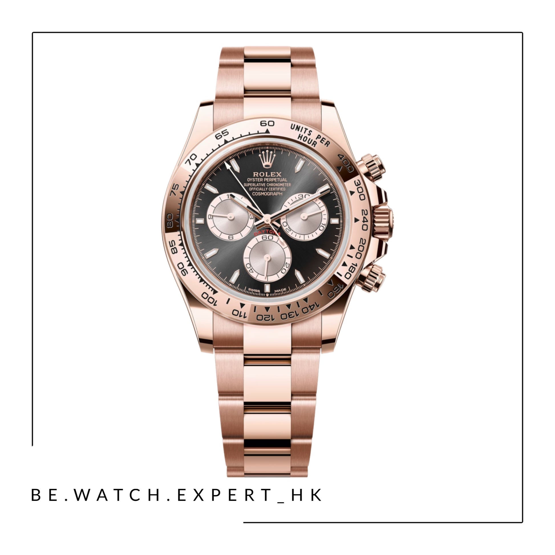 18K永恒玫瑰金款,搭配亮黑色及日亮金色錶面及蠔式(Oyster)錶帶,18K永恒玫瑰金外圈刻有測速計