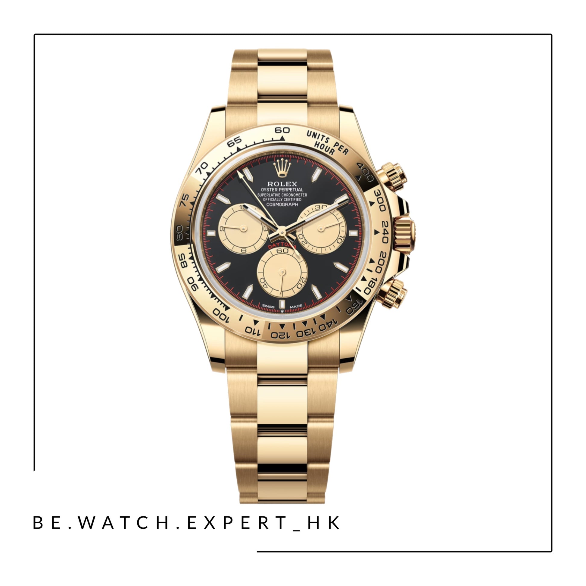 18K黃金款,搭配醇黑色及香檳色錶面及蠔式(Oyster)錶帶,18K黃金外圈刻有測速計