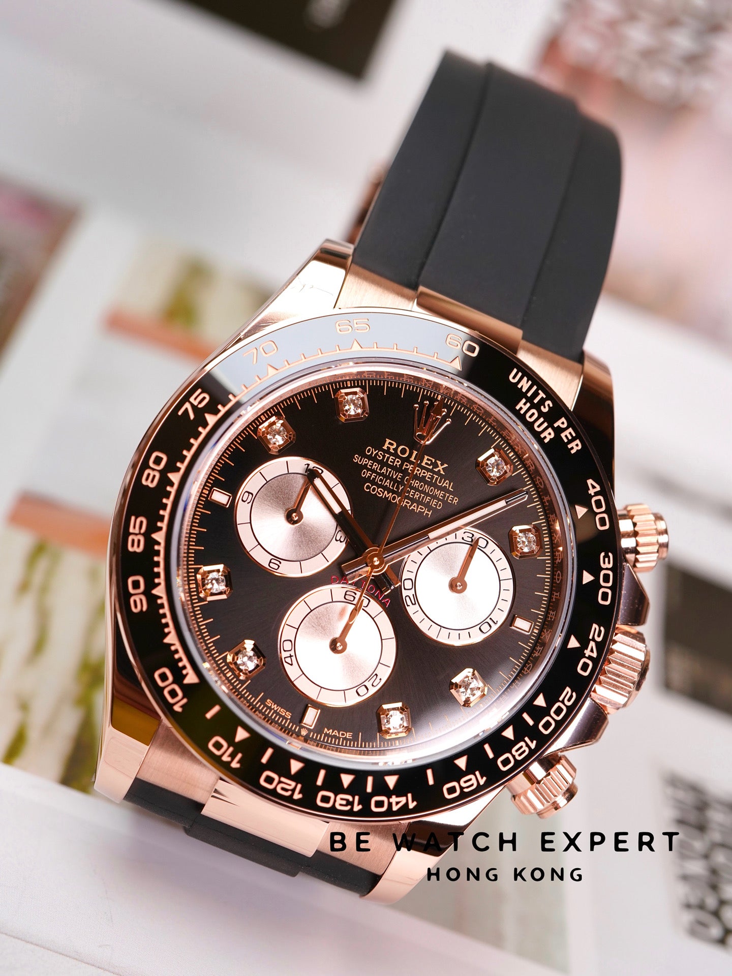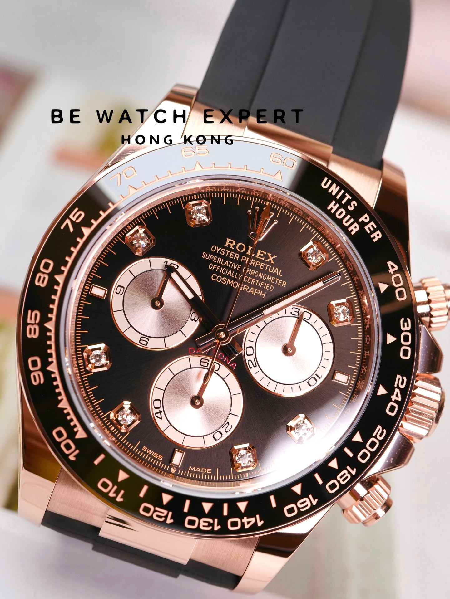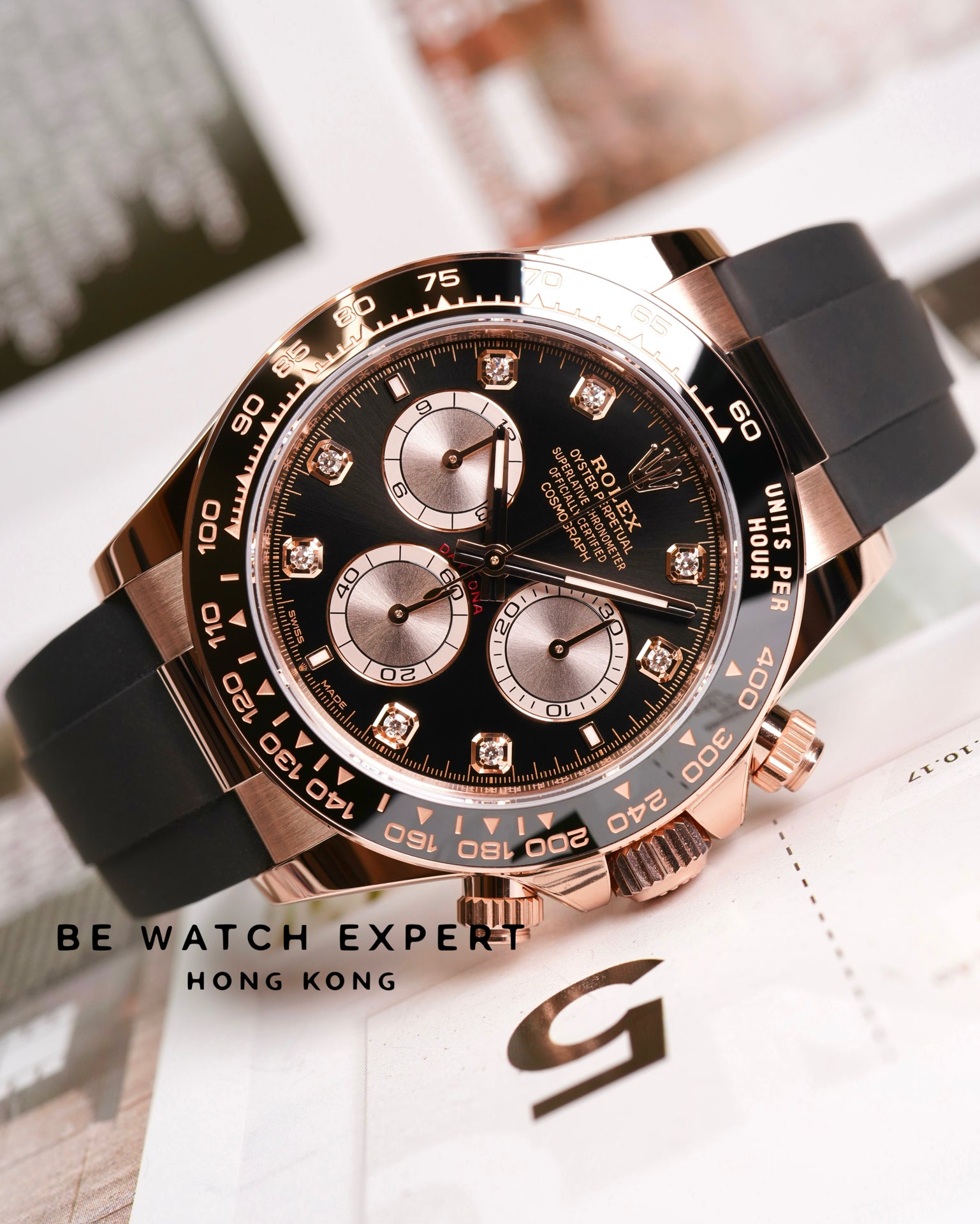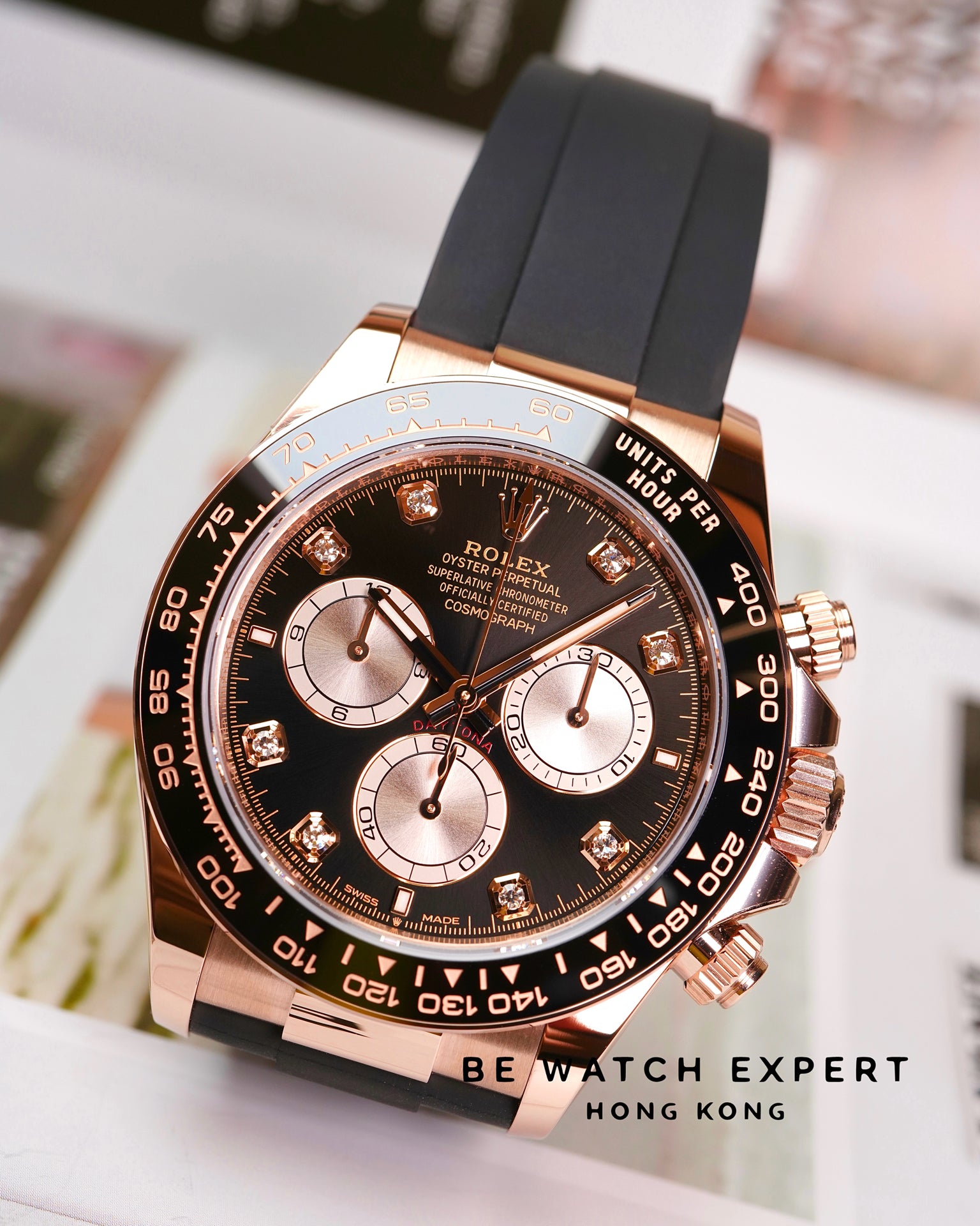 18K永恒玫瑰金款,搭配鑲鑽亮黑色及日亮金色錶面及Oysterflex錶帶,黑色Cerachrom外圈刻有測速計