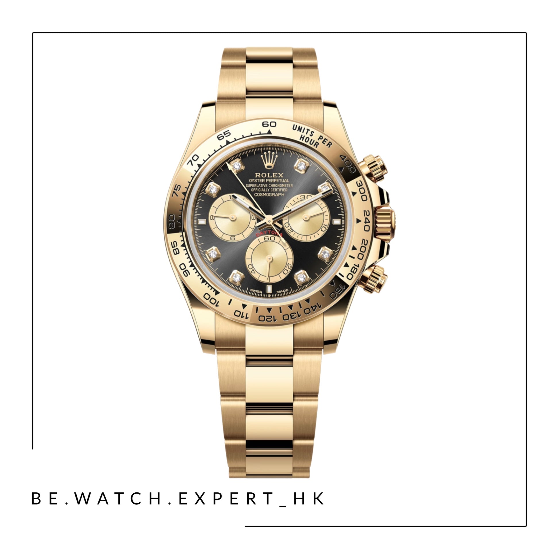 18K黃金款,搭配鑲鑽亮黑色及金色錶面及蠔式(Oyster)錶帶,18K黃金外圈刻有測速計