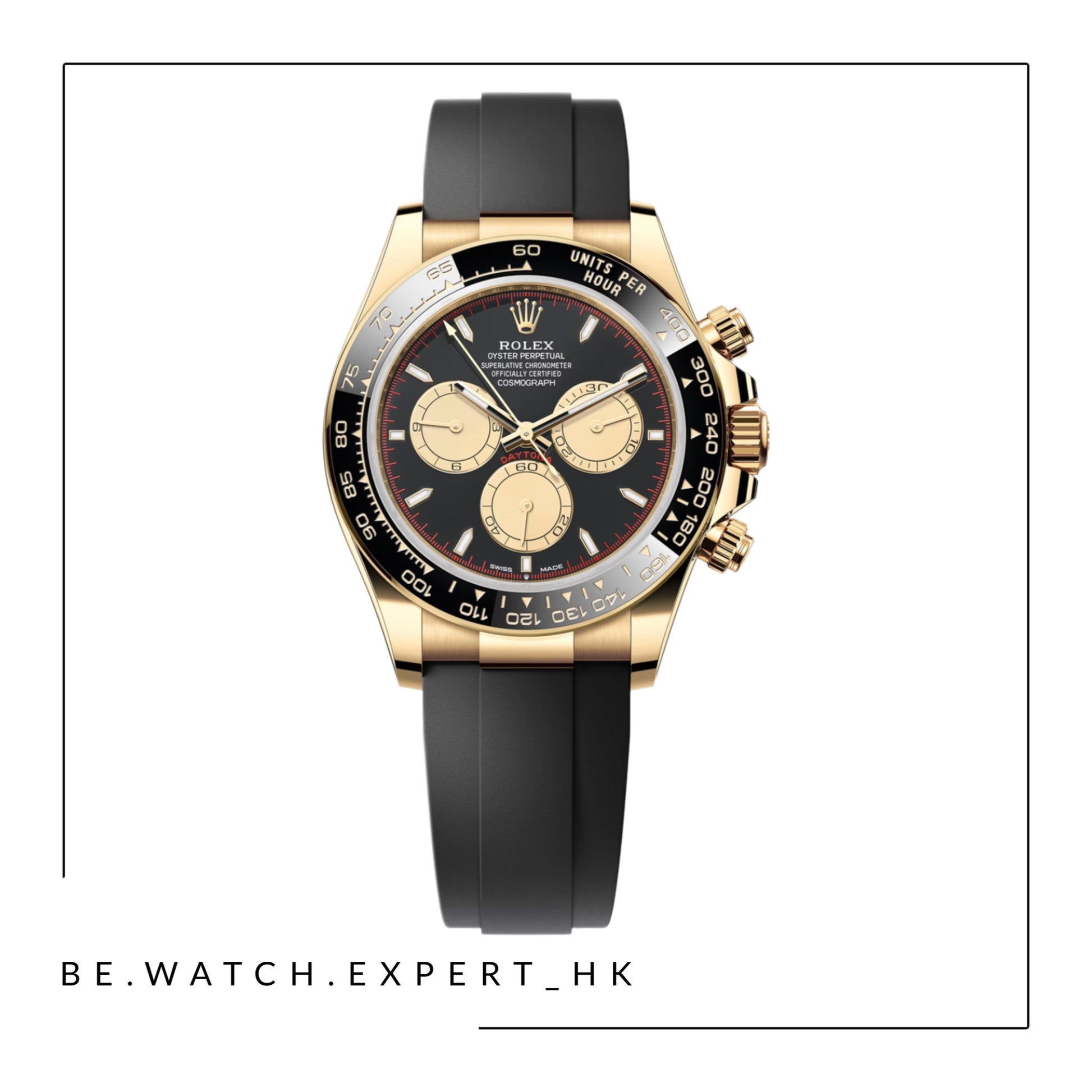 18K黃金款,搭配醇黑色及香檳色錶面及Oysterflex錶帶,黑色Cerachrom外圈刻有測速計
