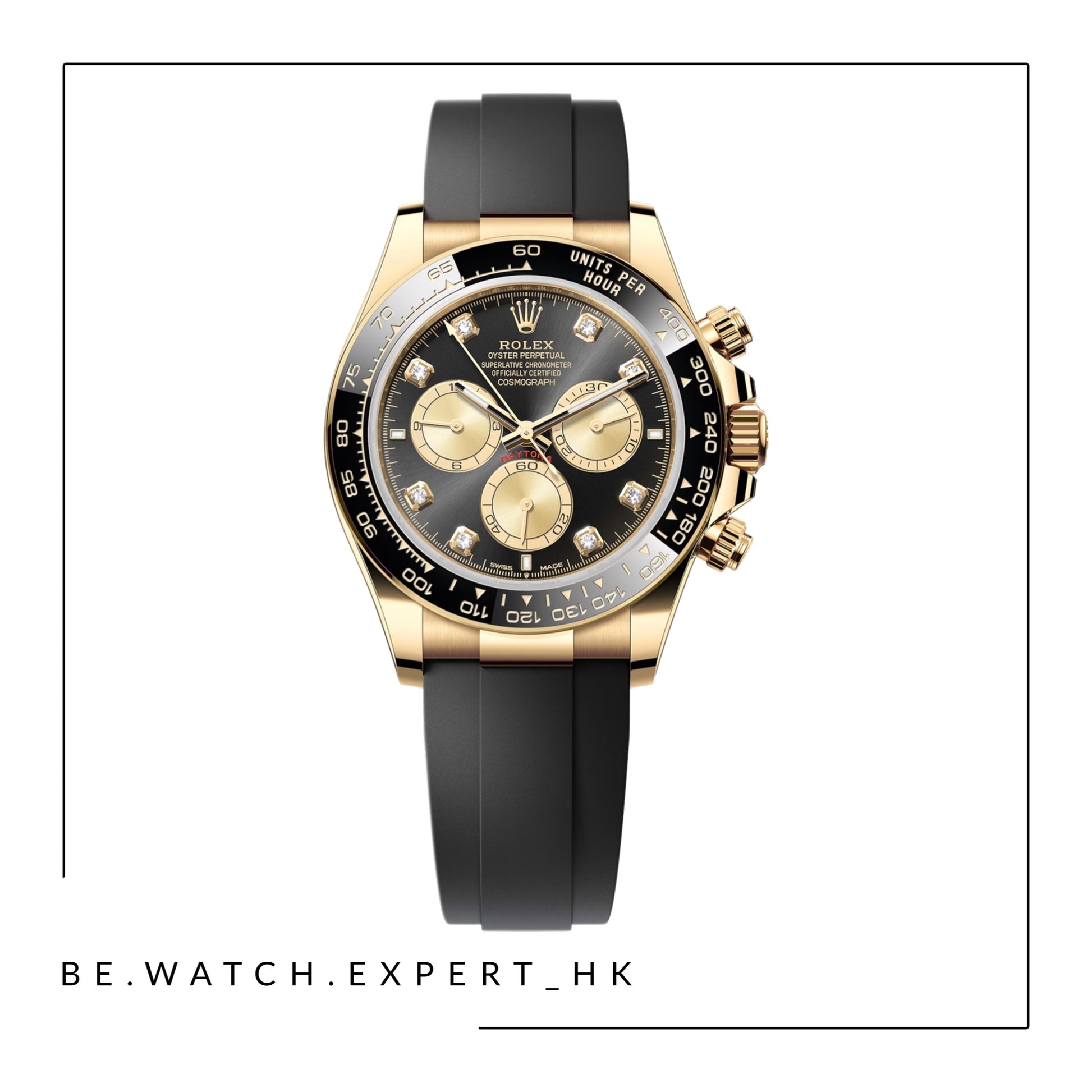 18K黃金款,搭配鑲鑽亮黑色及金色錶面及Oysterflex錶帶,黑色Cerachrom外圈刻有測速計