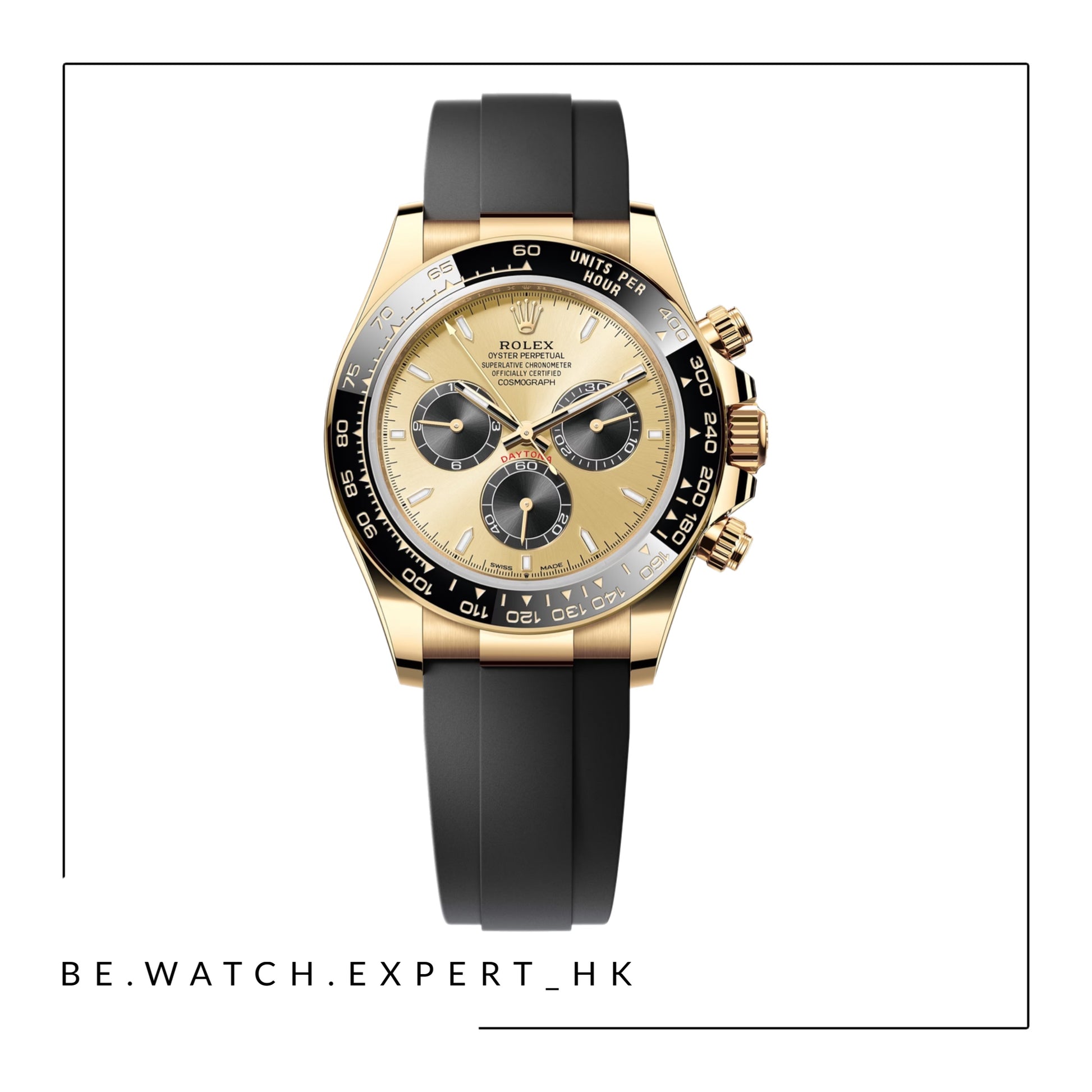 18K黃金款,搭配金色及亮黑色錶面及Oysterflex錶帶,黑色Cerachrom外圈刻有測速計