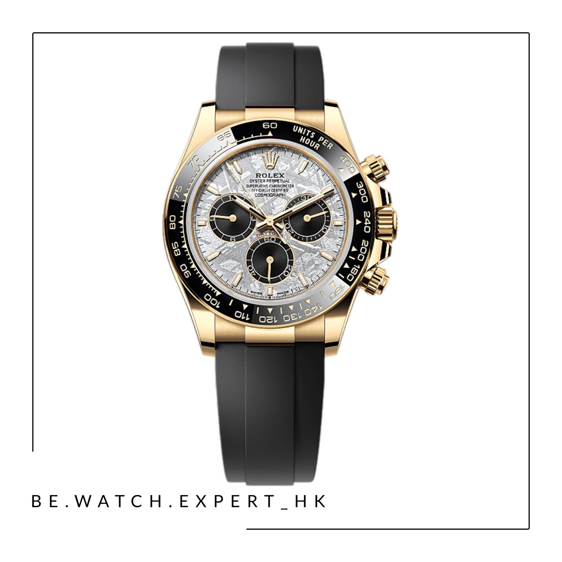 18K黃金款,搭配隕石及黑色錶面及Oysterflex錶帶,黑色Cerachrom外圈設測速計
