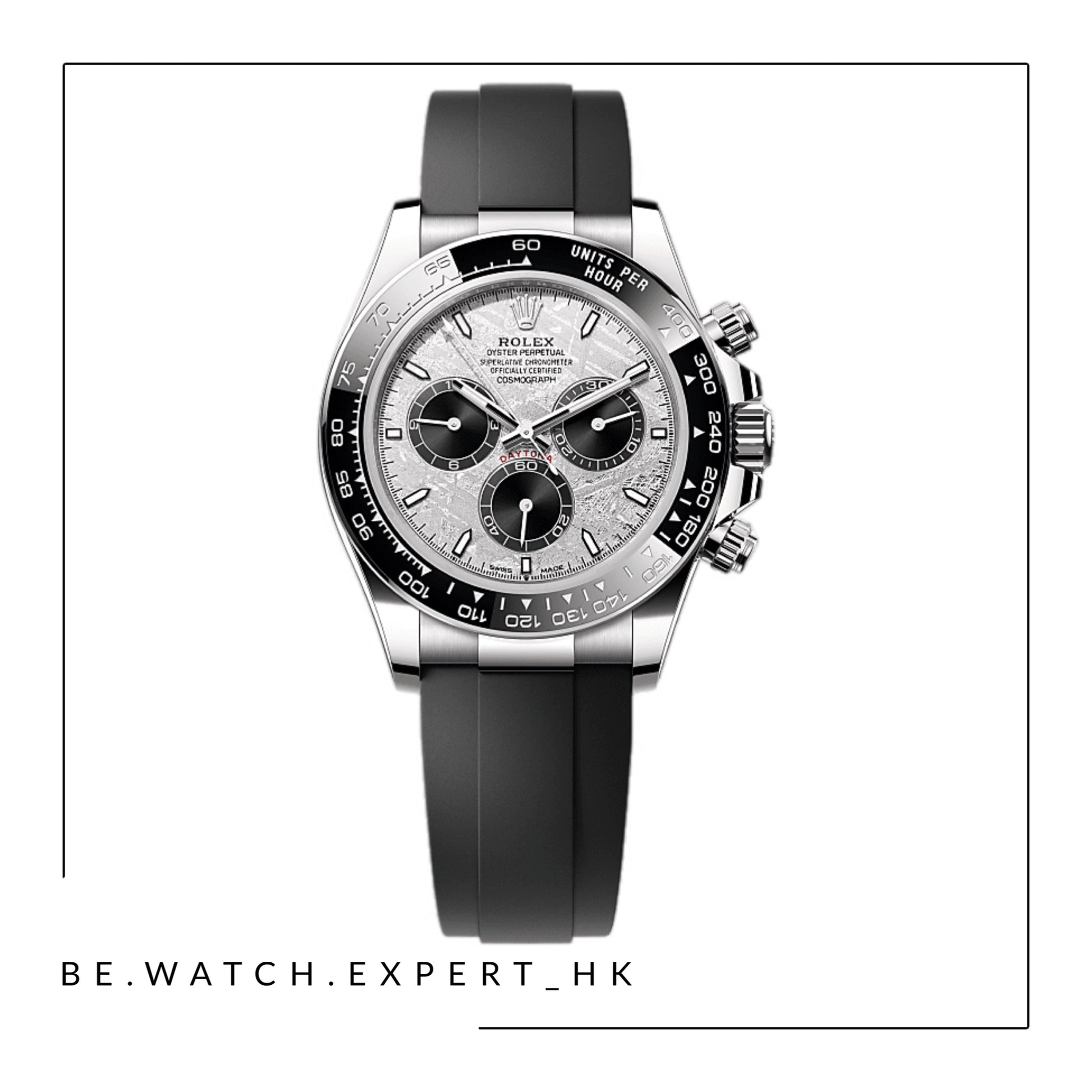 18K白色黃金款,搭配隕石及黑色錶面及Oysterflex錶帶,黑色Cerachrom外圈設測速計