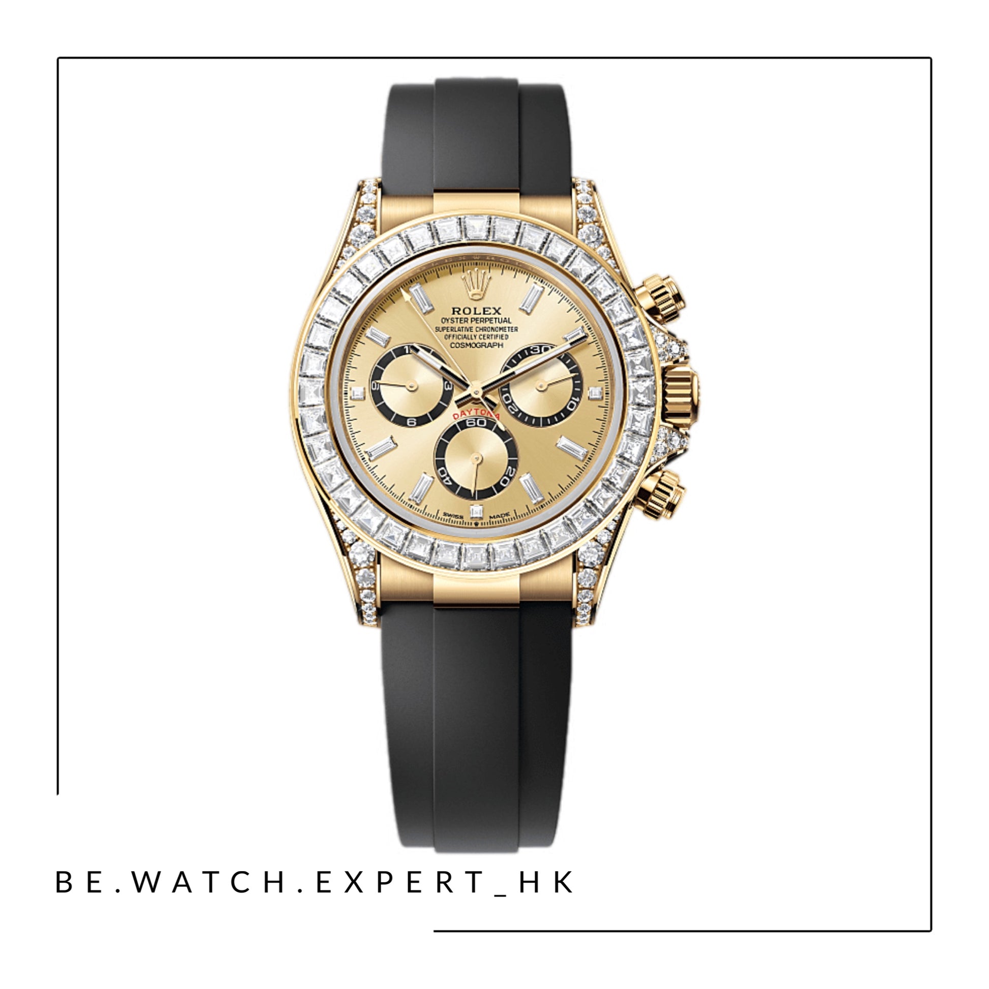 黃金款,搭配鑲鑽金色錶面和色彩對比鮮明的計時盤、Oysterflex錶帶、鑲鑽外圈及鑲鑽錶耳