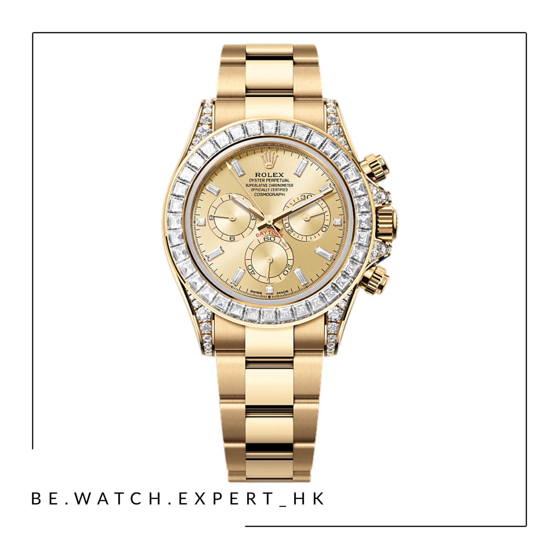 18K黃金款,搭配鑲鑽金色錶面、蠔式 (Oyster)錶帶、鑲鑽外圈及鑲鑽錶耳